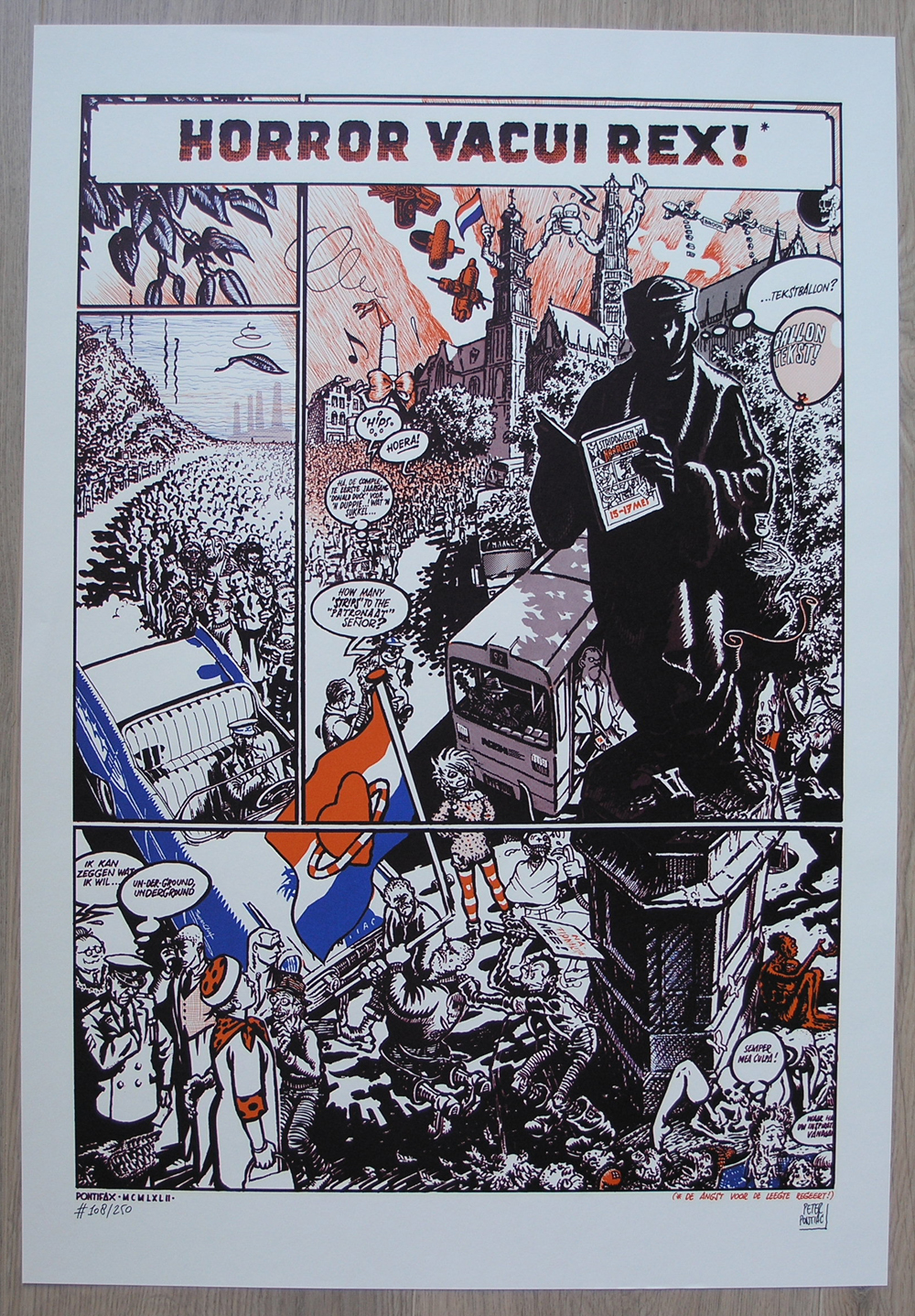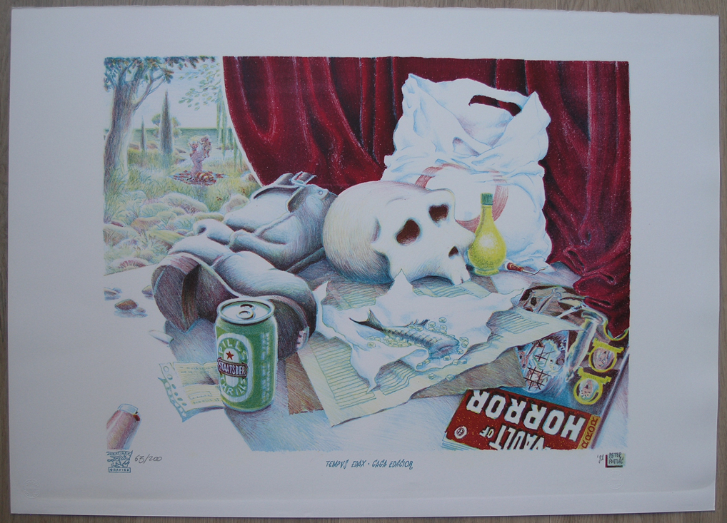 Peter Pontiac ( Peter J.G. Pollmann ) was one of the leading underground dutch comic artists, but in the past 10 years i have learned that he has a very loyal following outside the Netherlands. His style is unique and can be recognized immediately and through the years he more and more moved away from the comic style he used in his early years. Like Joost Swarte, he became involved in other aspects of graphic arts and designed and published together with Oog & Blik and Griffioen grafiek. His subjects scenes ranged from his personal life and sex to the darker side of society. In almost all cases it had a sombre, dark tone which was emphasized with very detailled drawings