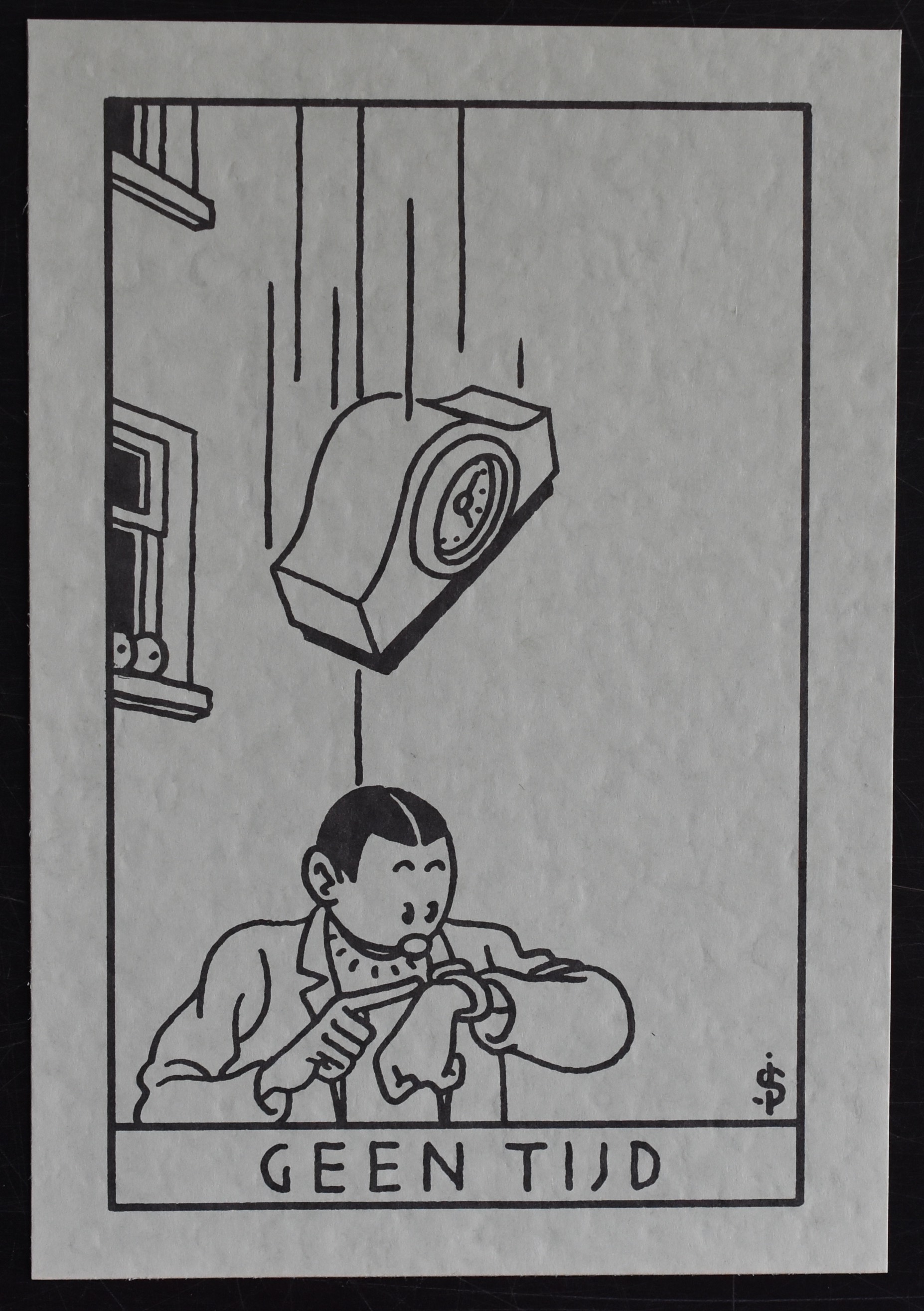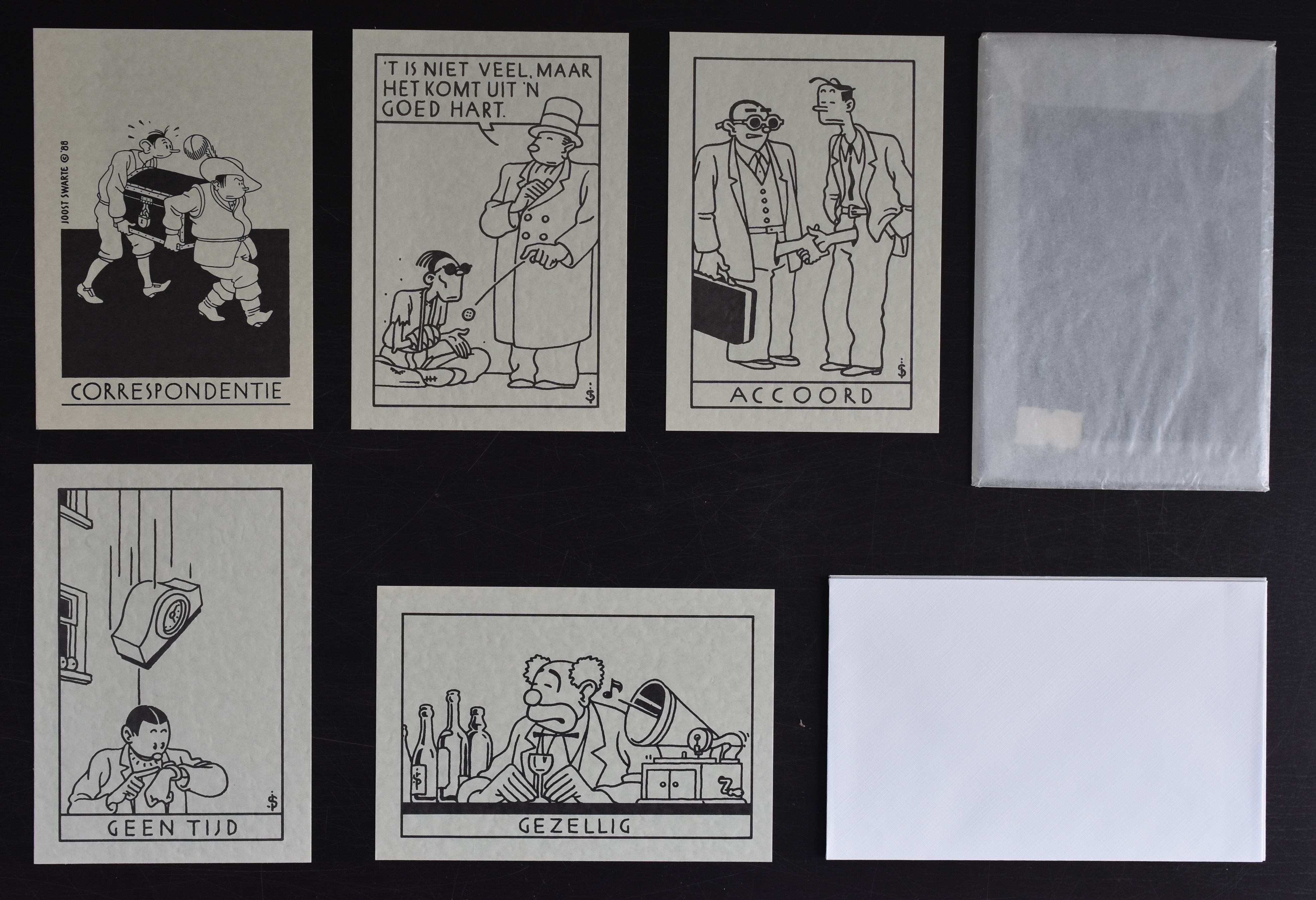 This is a set i bought in 1985 and forgot completely….until….. I opened a shoebox of mine and found the mini portfolio by Franck Izard ( see www.ftn-books.com) , opened it and within the portfolio there was this CORRESPONDENTIE set by Joost Swarte. Still completely sealed and in pristine condition. To see which cards were within the set i opened it very carefully with a very sharp knife and discovered 5 different small note cards, printed an greenish/grey paper and a set of 5 old fashioned envelopes. The attention to detail is so typical for Joost Swarte. The set is in Mint condition and i decided to offer it for sale at www.ftn-books.com. This is a true collectors edition , but for those that only want the pictures ….here are a few pictures.