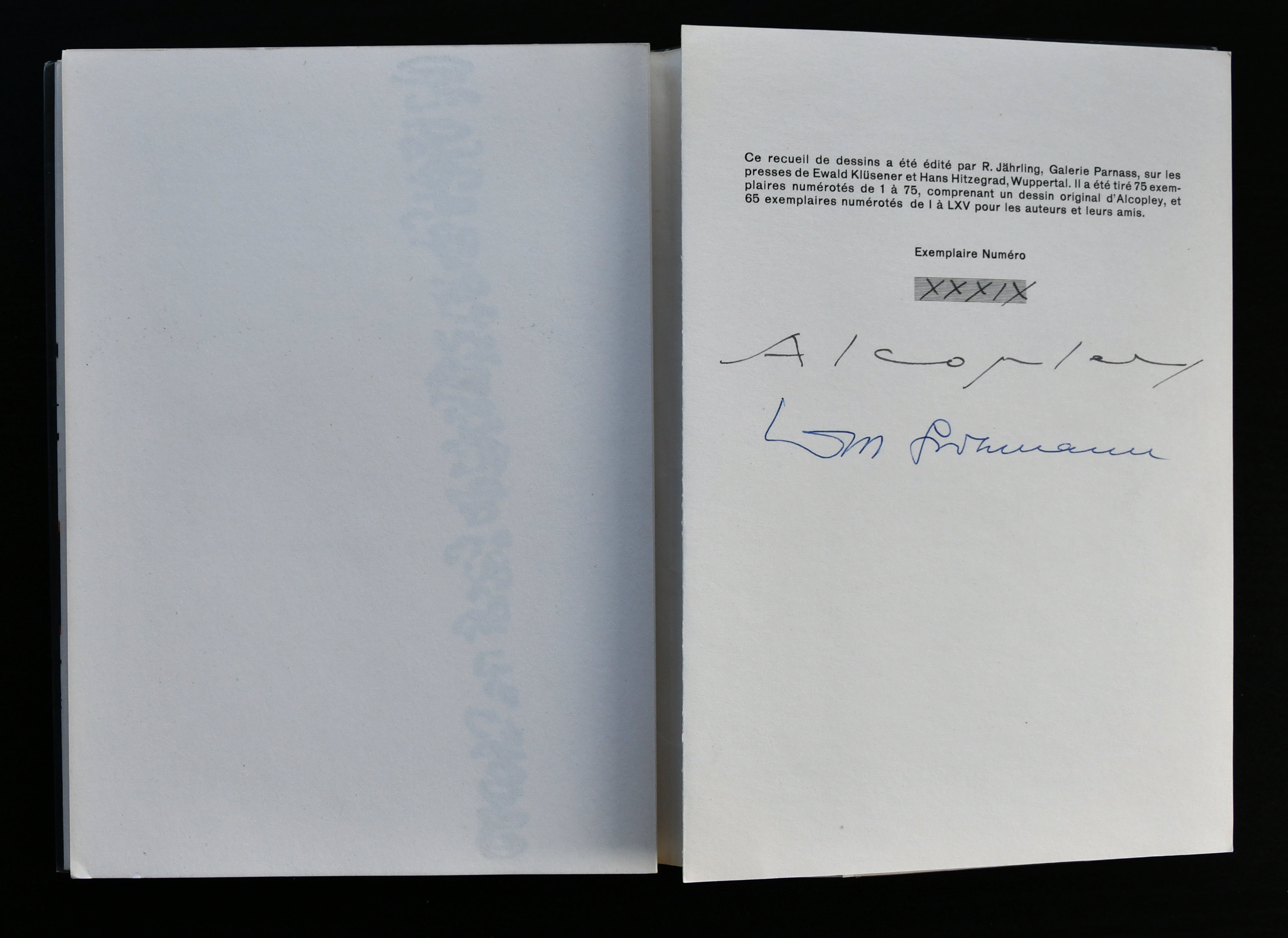 Do not make the mistake i originally made. Lewin Alcopley and Al Copley (cply) are 2 completely different artist where CPLY is rooted in the Pop Art scene. Alcopley is the more abstract artist and rooted in abstract expressionism.   I now have added one of the rarest of his publication to the inventory of www.ftn-books.com. It is a book published in a roman numbered edition by galerie Parnass in 1961 and one of only 65 roman numbered copies which contains, beside 32 prints in black on white paper, a beautiful and impressive lithograph used as special cover. Book in slipcase and signed by the artist and author. Numbered in inkt. This book is numberXXXIX from LXV This book is very special and an absolute must have for the serious Alcopley collector.