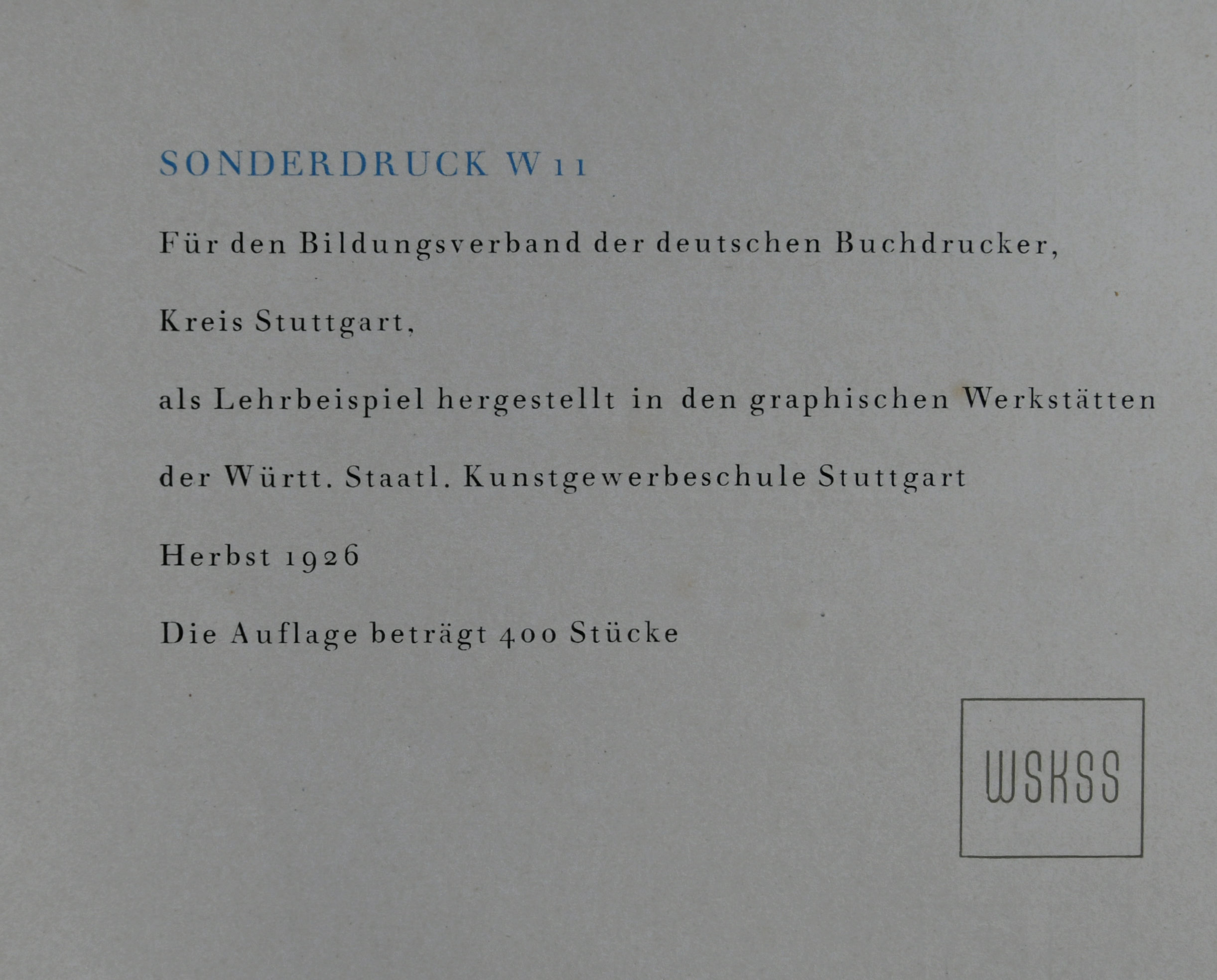 I am proud to have finally found one of these iconic publications by the Staatliche Kunstgewerbeschule Stuttgart. It was a lucky find, but still one i have been looking for for for many many years in the past. The location was secret for many years because it was protected by another book which i recently had bought and which is roughly from the same date. It must have been the former owner who knew its value and wanted to protect the precious publication. These Stuttgarter Hefte were published in only 400 copies in the mid Twenties and printed in the printing rooms of the Kunstgewerbeschule. Everything is special about these publications. Sizes are far larger than usual. The lay out is impressive and the designs are true avant-garde for those years. This one was printed in 1926 and as said in an edition of only 400 copies. I am sure that only a few have survived over the years and most of these have found new owners or are in important libraries. I found the set being a part of the MOMA collection and when i tried to find other copies on the internet….. i found as expected…. ZERO of them. Now this excellent copy is for sale. On a scale of 1 to 10 i would rate this one at 8+ points