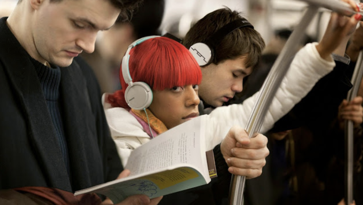 In 2008, on a hot day in May, I was walking along the Thirty-Third Street subway platform in New York City. Suddenly they were there, as if I had asked them to pose for me. Red lips, a red bag, and a red sweater. The reds all happened to be in the right place. I pressed the button several times. A blond woman stood reading One Hundred Years of Solitude by Gabriel García Márquez, a look of concentration on her face; she was clearly reading a sad part of the book. My second character was intently reading Ayn Rand. Another woman was reading a book from her Kindle device. Unfortunately, Kindle does not display the cover of the book being read, so I will never know what she was reading. In the background of the photograph I took that day, you can see a man looking suspiciously into my camera.