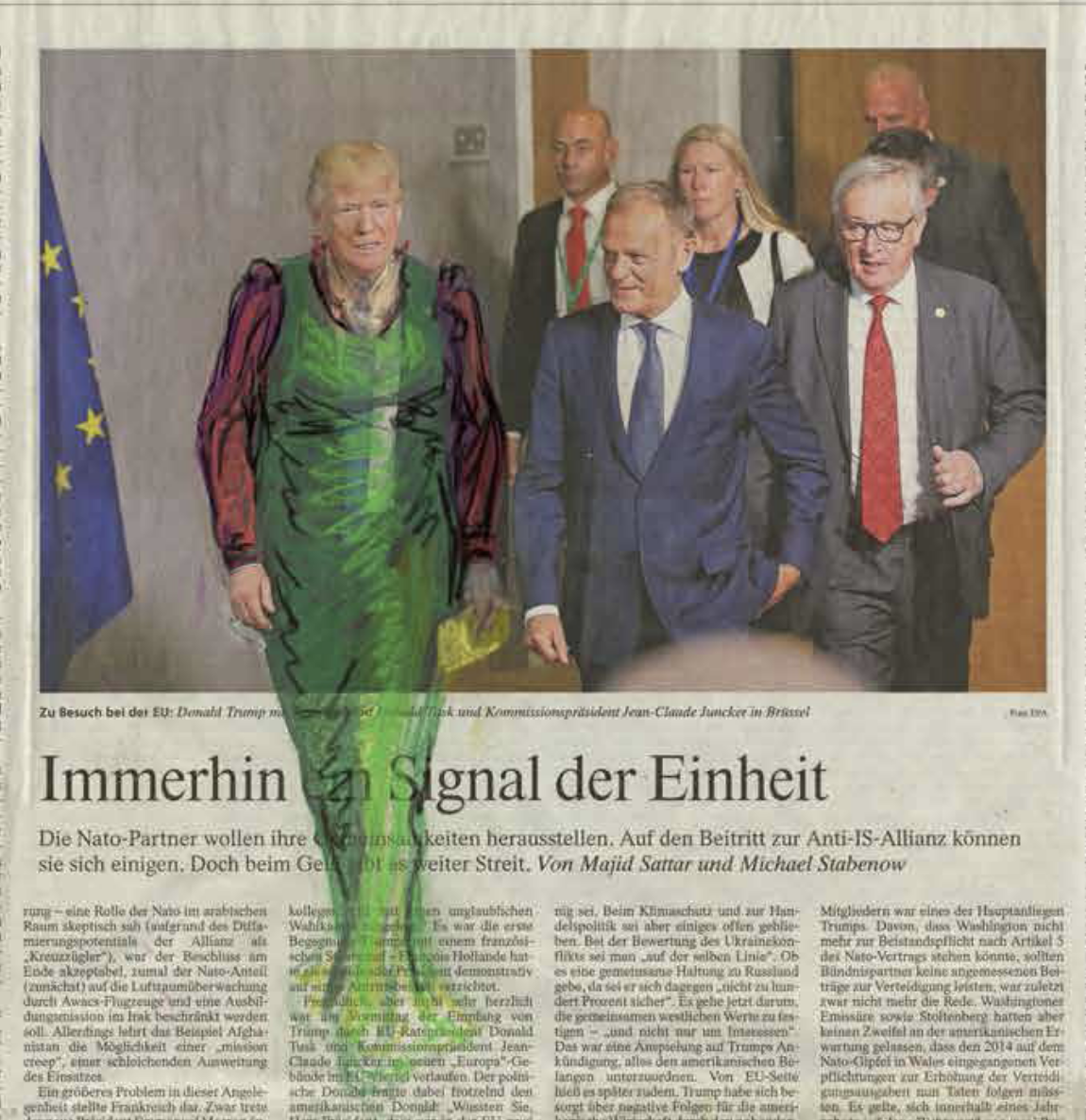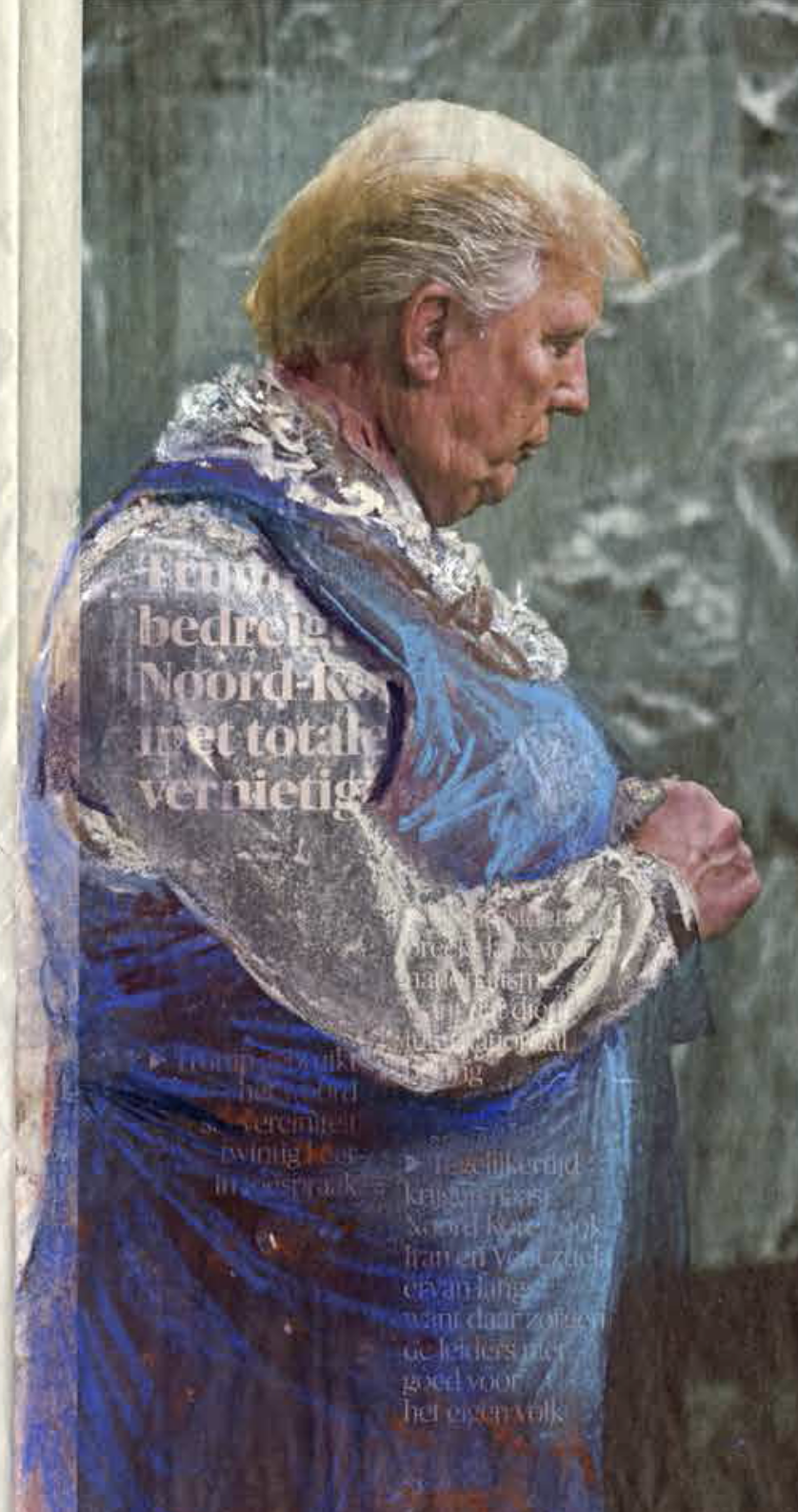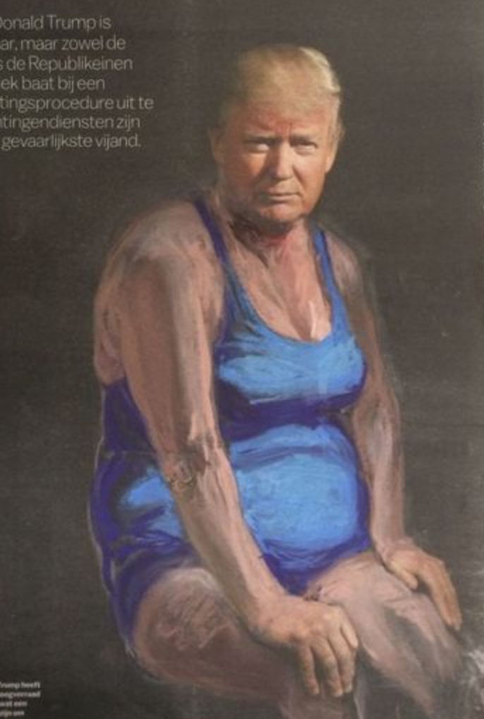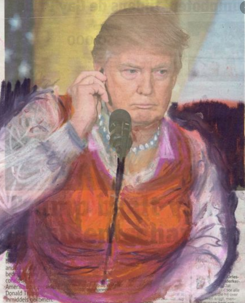 An excellent title with drawings by Nijkamp , which remind me of the early drawings by Frank van Hemert influenced by Anselm Kiefer. but……visiting her site i noticed that she had published a complete series of Donald Trump dressed in Womans Clothing. A “funny” series of pastel drawings on international newspapers. It is not funny only , but it shows some criticism towards Donald Trump and his presidency. Trump takes poses like the great states man he think he is, however…..the drawings make fun of him and puts his presidency into perspective. The best one is the Obama meeting. Obama is the statesman and Trump the one with a dress on. I can not vote for any US president , but i wish i could and i would not have any doubt who to vote for.