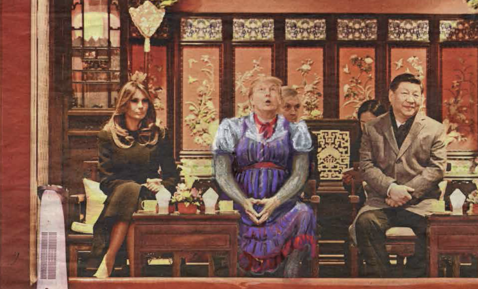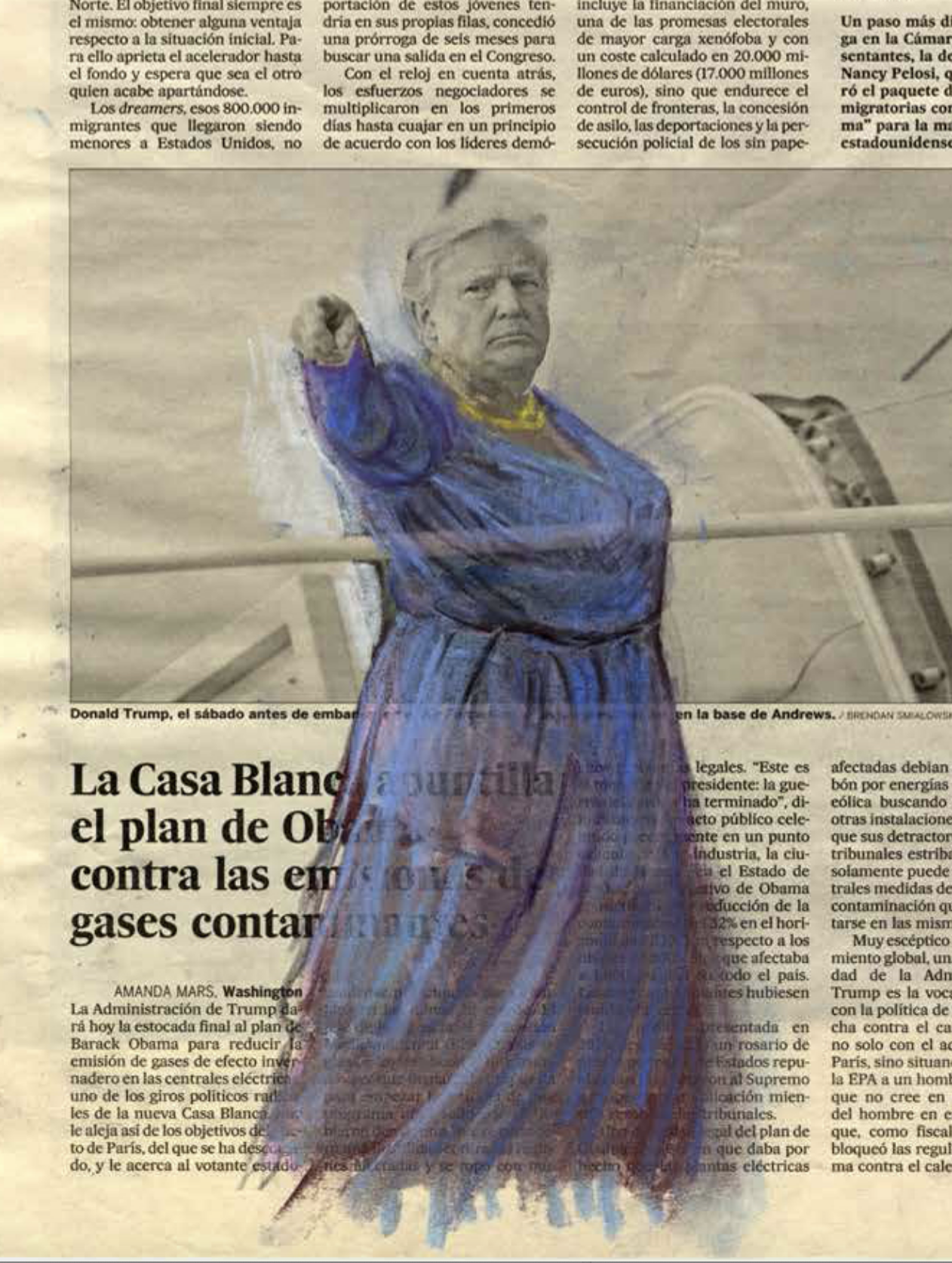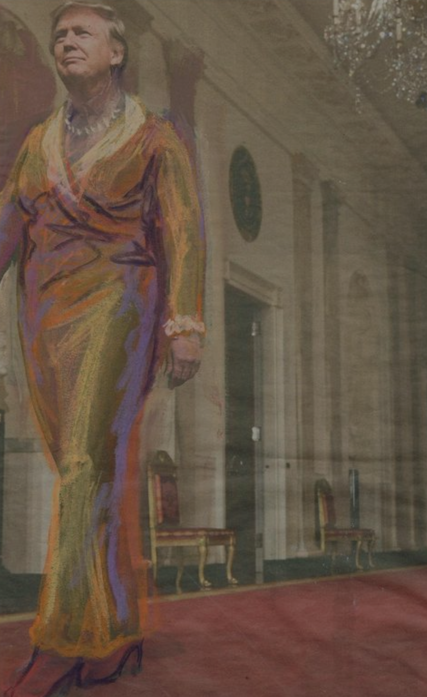 An excellent title with drawings by Nijkamp , which remind me of the early drawings by Frank van Hemert influenced by Anselm Kiefer. but……visiting her site i noticed that she had published a complete series of Donald Trump dressed in Womans Clothing. A “funny” series of pastel drawings on international newspapers. It is not funny only , but it shows some criticism towards Donald Trump and his presidency. Trump takes poses like the great states man he think he is, however…..the drawings make fun of him and puts his presidency into perspective. The best one is the Obama meeting. Obama is the statesman and Trump the one with a dress on. I can not vote for any US president , but i wish i could and i would not have any doubt who to vote for.