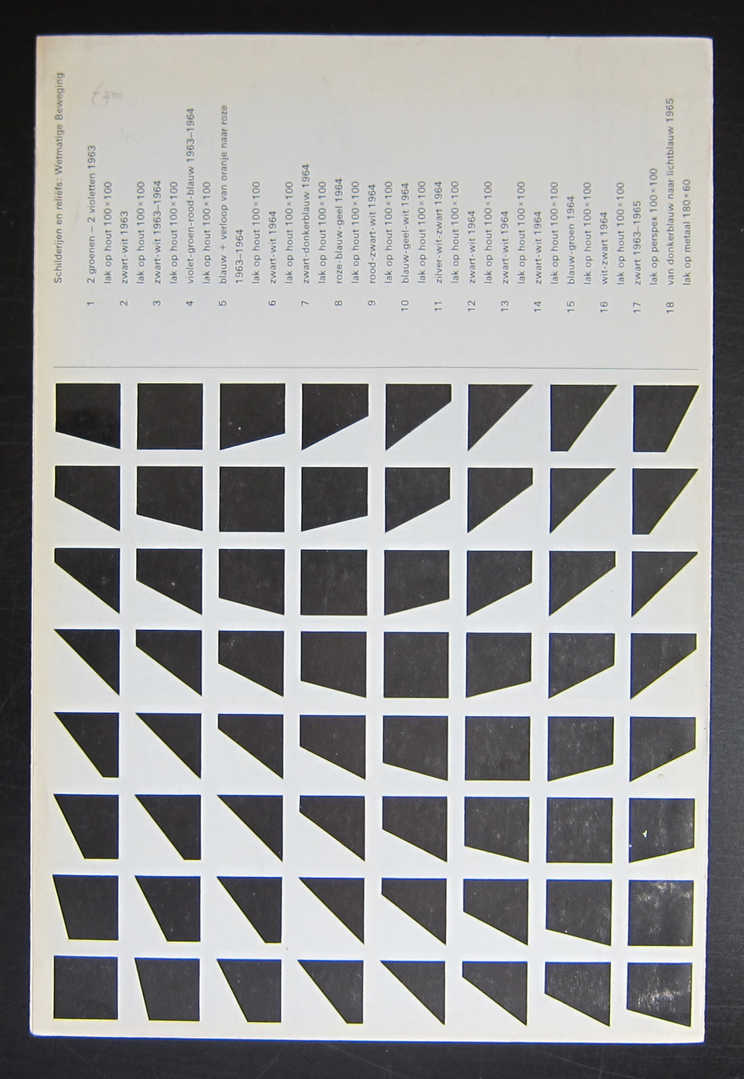 The publication was published in the mid sixties and the only dutch museum that did something ” special ” with their publications at that time , was the Stedelijk Museum, however this publication shows that the Haags Gemeentemuseum knew about the importance of good design and because the artist himself did the design, an excellent and collectable multiple was published. The Structuur 67 consists om several silkscreened sheets , all bundled within one see through cover , making together a constructivist composition. One of the first special Struycken publications , which would be followed by many more. Struycken always had his special wishes regarding most of his publications which resulted in highly collectable “multiple” items. The monograph which was published some years ago gives an excellent overview of these publications.