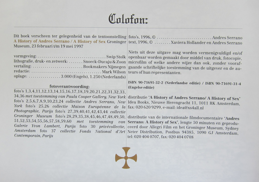 Taschen made an excellent book titled AMERICA with Serrano and it is one of the books i keep for my own collection. A little search resulted in enough copies for the collector to add this to his or her collection, but there is another one… a much harder to find book which was published with the Groninger Museum exhibition A History of Andres Serrano/ A HISTORY OF SEX in 1997. The design was done by Swip Stolk ( the house designer at that time ) and blown up pictures from the exhibited collection were used as posters in the street. One of them ( a girl peeing in a mans mouth) hit the street , but was removed a couple of days later , because it was a little bit too shocking. Still the result of this publicity campaign was that the Groninger Museum registered a record number of people, who visited this exhibition. The catalogue sold out within a few weeks, with no reprint and has become one of the most searched for catalogues of the Groninger Museum…..and www.ftn-books.com luckily