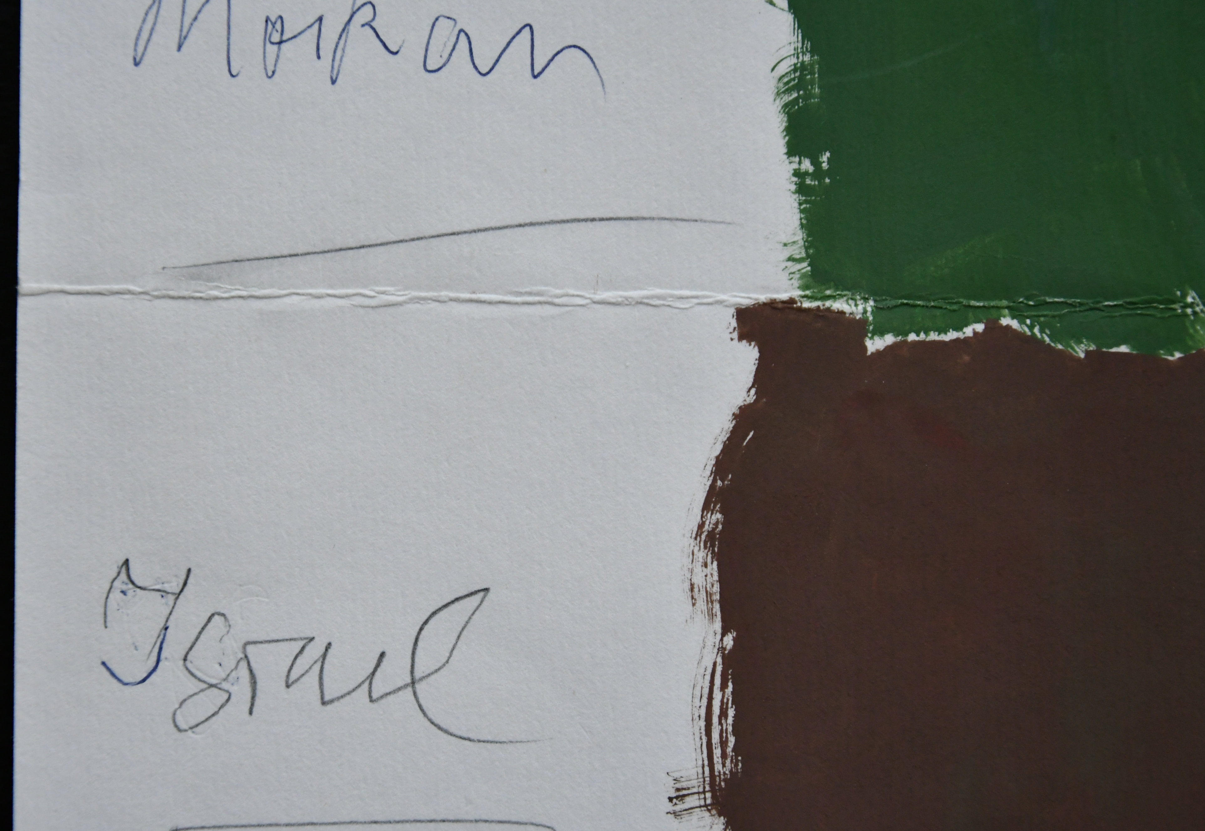 On the painted paper sheet is the studio stamp of Günther Förg in Freiburg and the paper is devided into two parts. The upper part is painted with a deep green and handwritten the text Gemeentemuseum in blue ballpoint, underneath in pencil Den Haag 2003.  Left of the green a text in blue ballpoint ” Moikan (?)” The lower part of the design/drawing/painting is in a “leather brown” color and in pencil beside “Israel” is written . On the lowest part of the sheet the studio stamp in black ink.