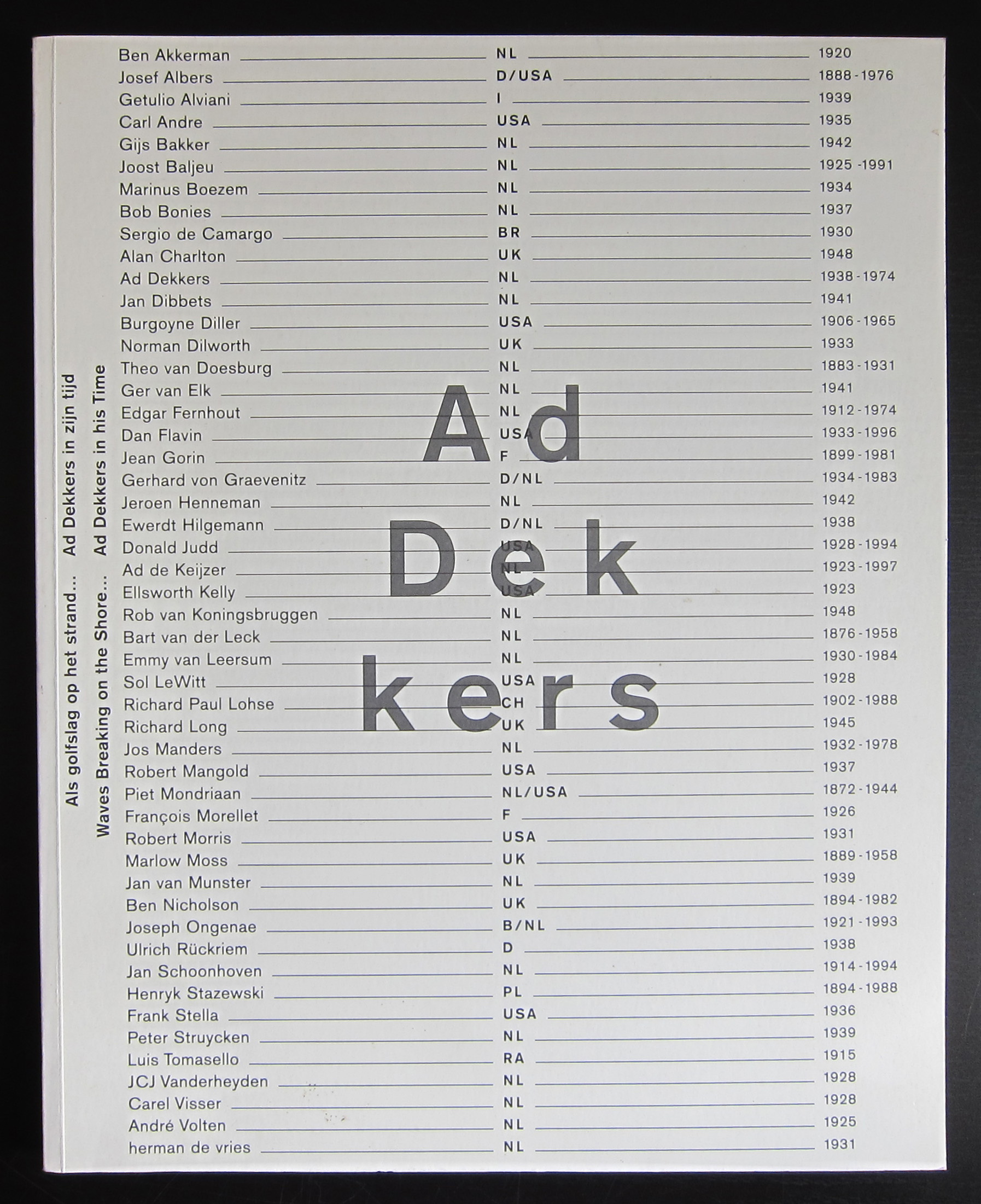 Ad Dekkers was probably the first dutch minimal artist and even is somehow related to the dutch NUL / ZERO art of the sixties and because of his age 36 , on the day he died, there are not too many works by Dekkers. His oeuvre is limited and most of the important works are to be found in dutch ( museum) collections. ALL important dutch museums have work(s) by Ad Dekkers in their collections and these works prove to be more and more important when you look at them in conjunction with other art from the sixties and seventies. Dekkers announced his own death. He was manic depressed and his suicide was no surprise to the ones that had known him. He left us a great and important oeuvre and many of the publications are available at www.ftn-books.com