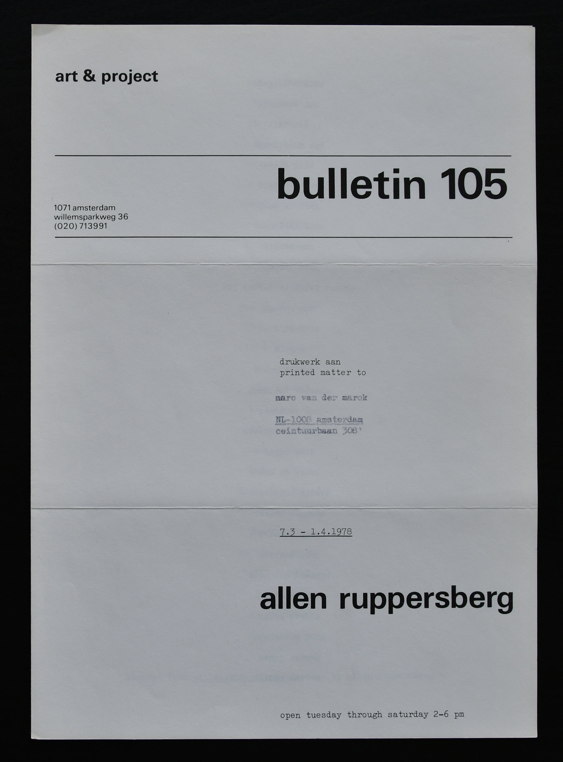 Allen Ruppersberg and the Netherlands is a combination which feels natural. It is a little bit the same like with Lawrence Weiner. Both were supported by Willem Sandberg and had their first major exhibitions outside the US in the Stedelijk Museum and after?……they kept a strong link with the Netherlands since both were represented by the Art & Project gallery who published with both important Bulletins within their series of Bulletins. Both these artists are considered by many as the next worldwide greatest, since Conceptual Art is becoming more and more important in time and admiration for these two is growing significantly.