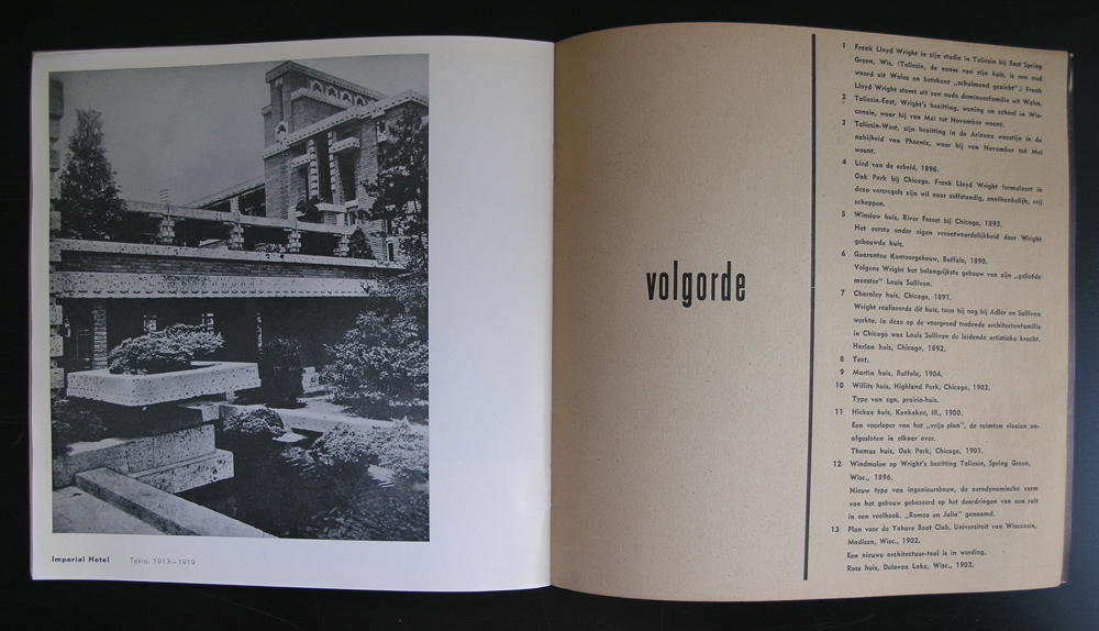 One of the first projects and designs Benno Wissing did for the Boymans van Beuningen Museum must have been this Frank Lloyd Wright catalogue “fllw”. The year is 1952 and the chosen size is different from the normal sized catalogues the Boymans had published until that date. But the size and lay out suits the subject of architecture. This is one of the hardest to find catalogues on Frank lloyd Wright and i was lucky to find a copy. The condition is not the best possible and i would rate it 6 out of 10 points , but still it is there and now available at www,ftn-books.com. This is the best from both worlds. Great graphic design meets top class architecture.