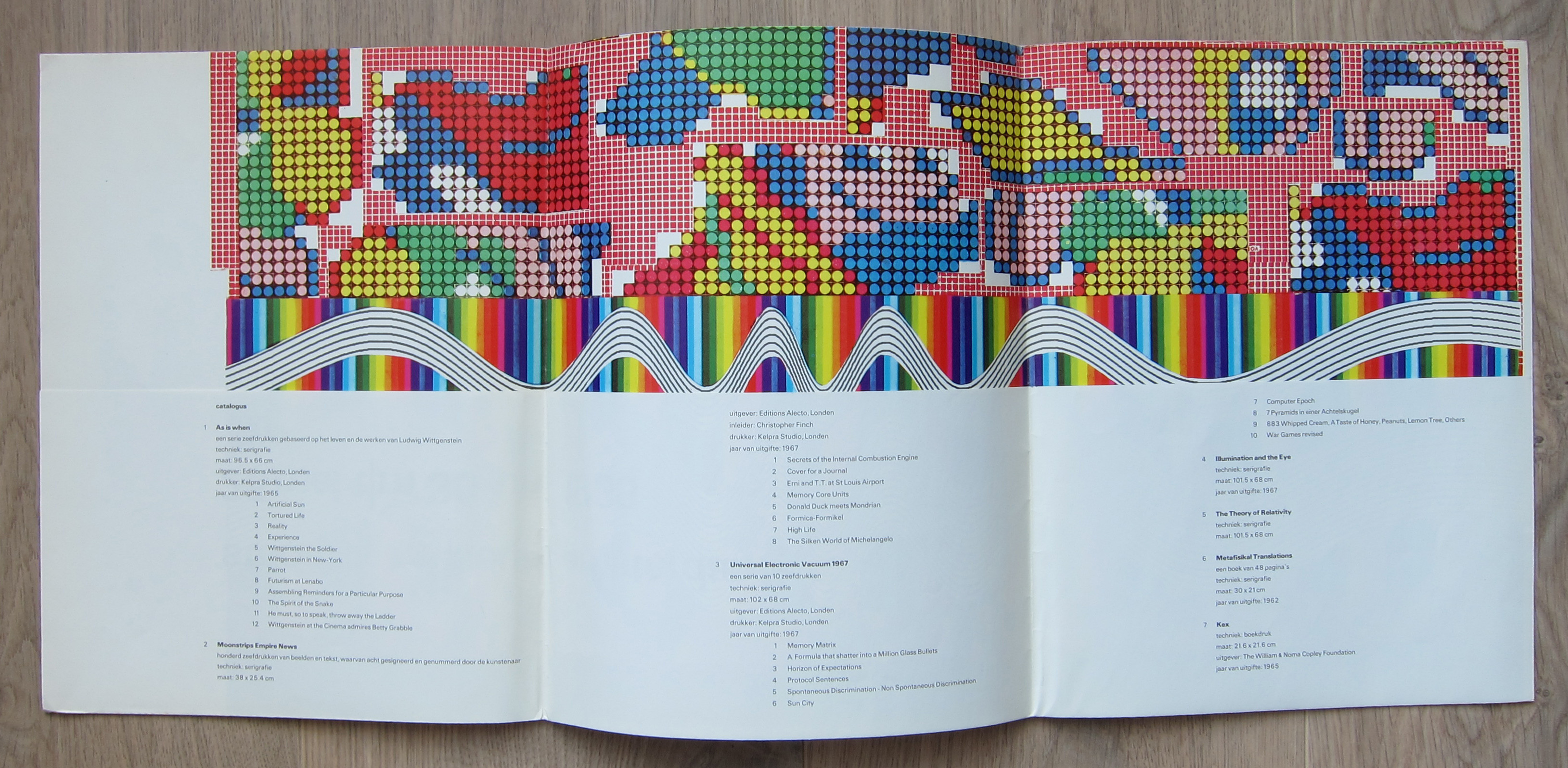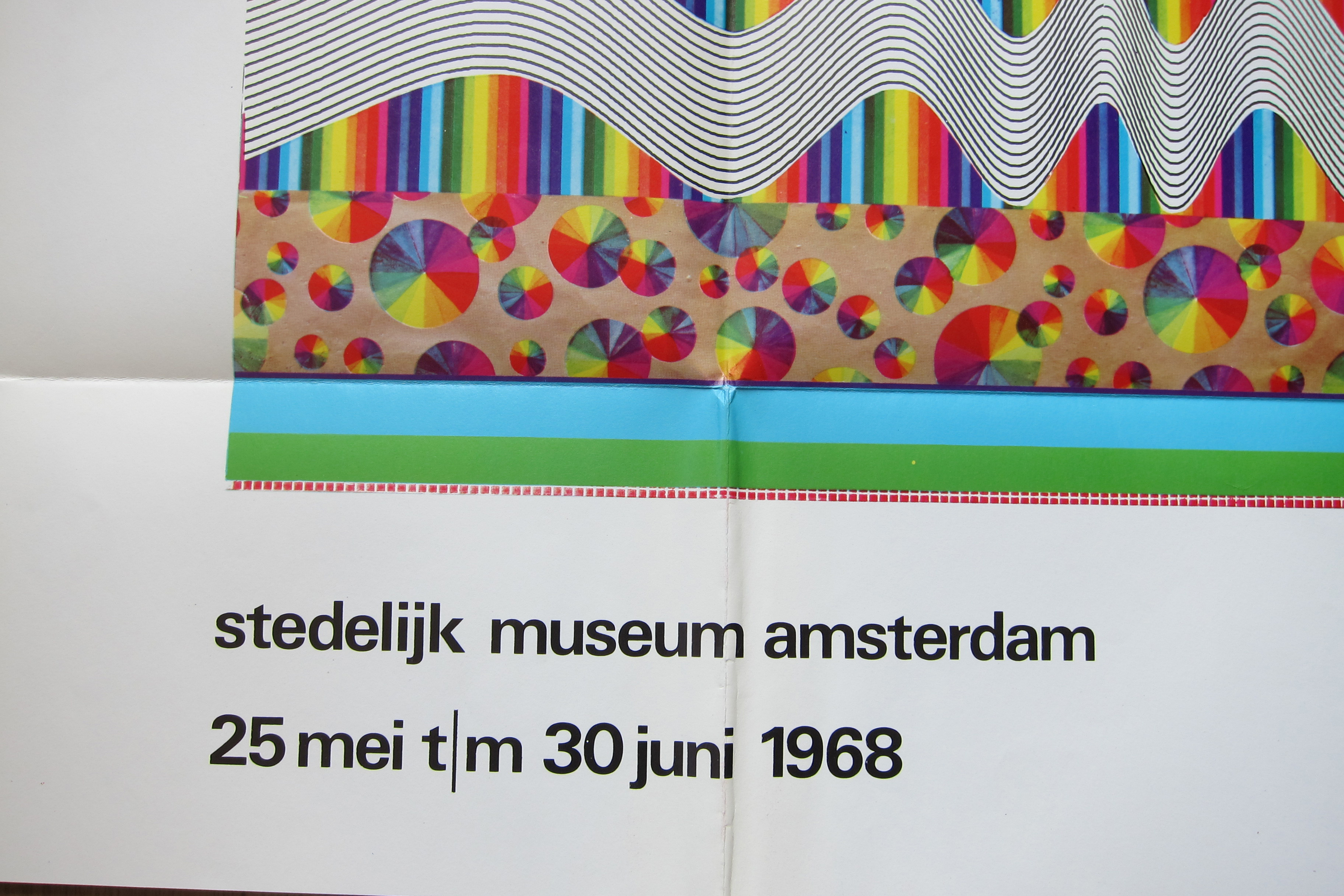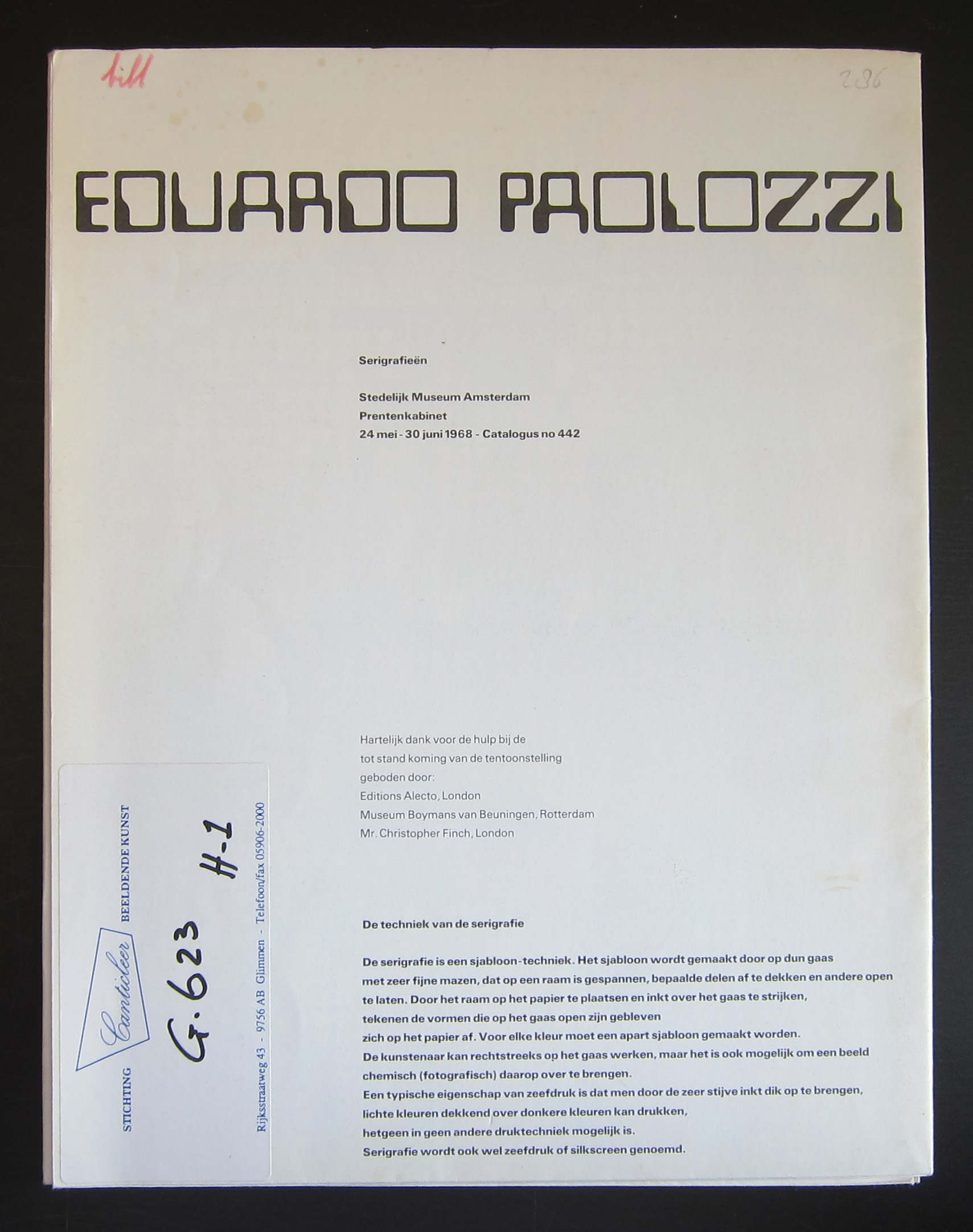 There are multiple reasons to like the publication no 442. of the Stedelijk Museum Amsterdam. Published in 1968 on the occasion of the Eduardo Paolozzi exhibition this is a 100% original work of art . A serigraphie by Paolozzi in his typical Pop Art style. Folded as issued and when folded out an impressive large work of art. Design?….by Wim Crouwel who used the backside of the serigraphie for all the information on Paolozzi. A great Pop Art work of art and available at www.ftn-books.com