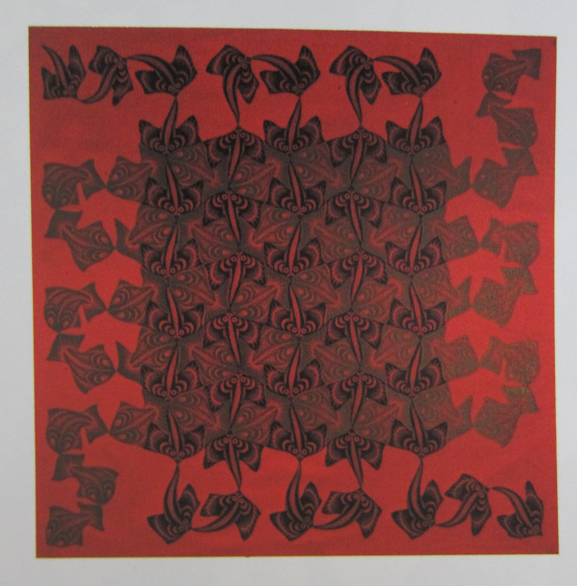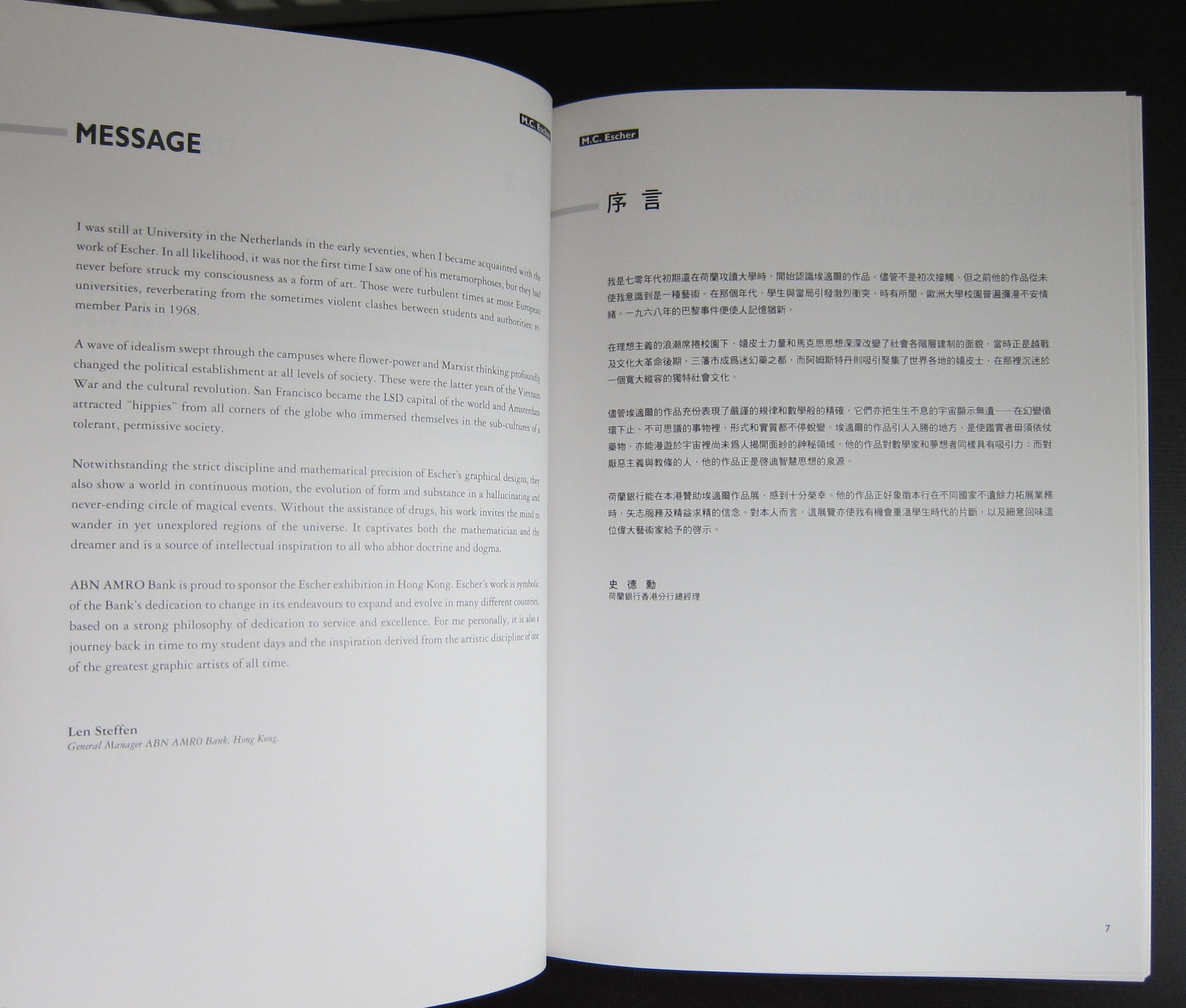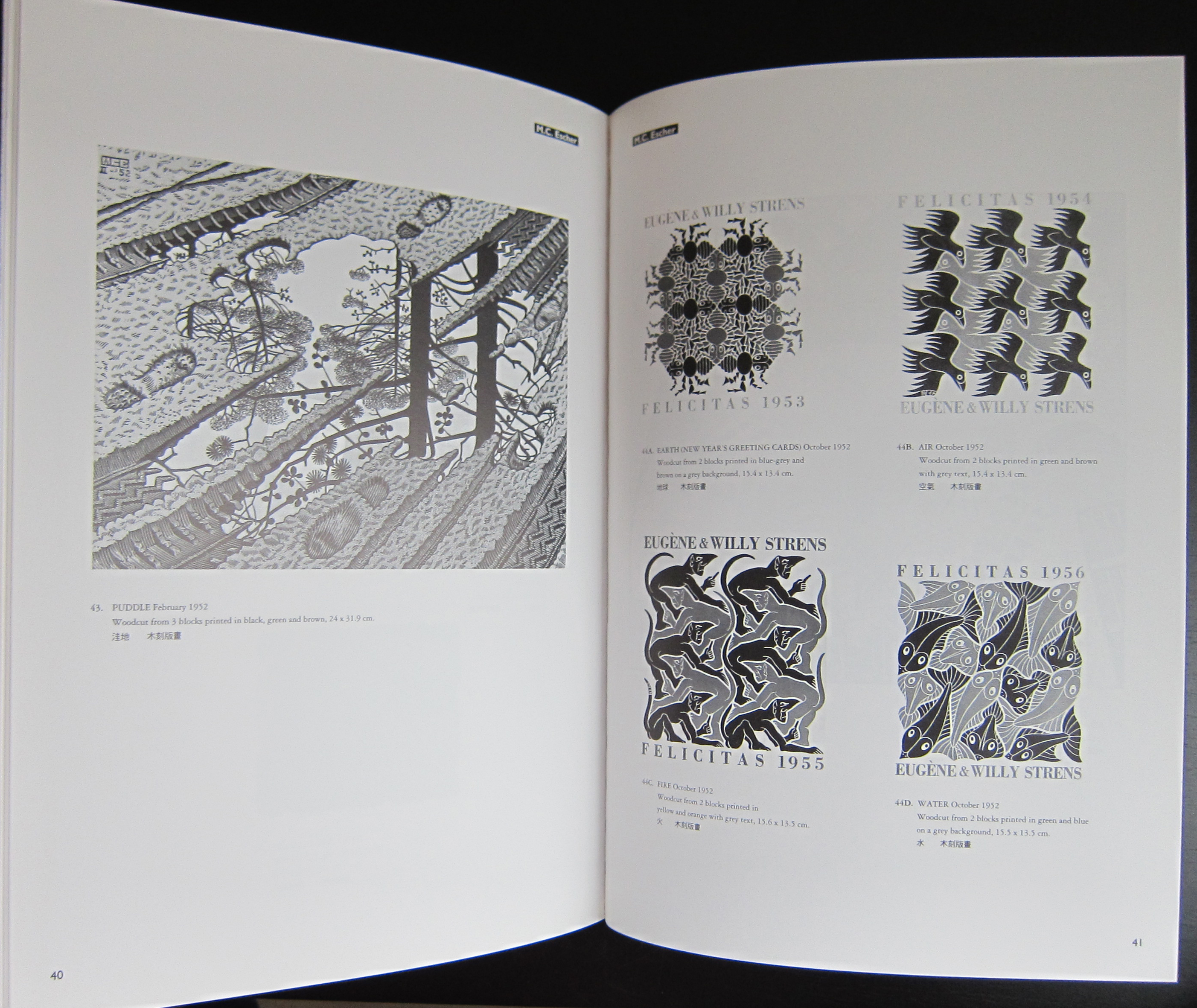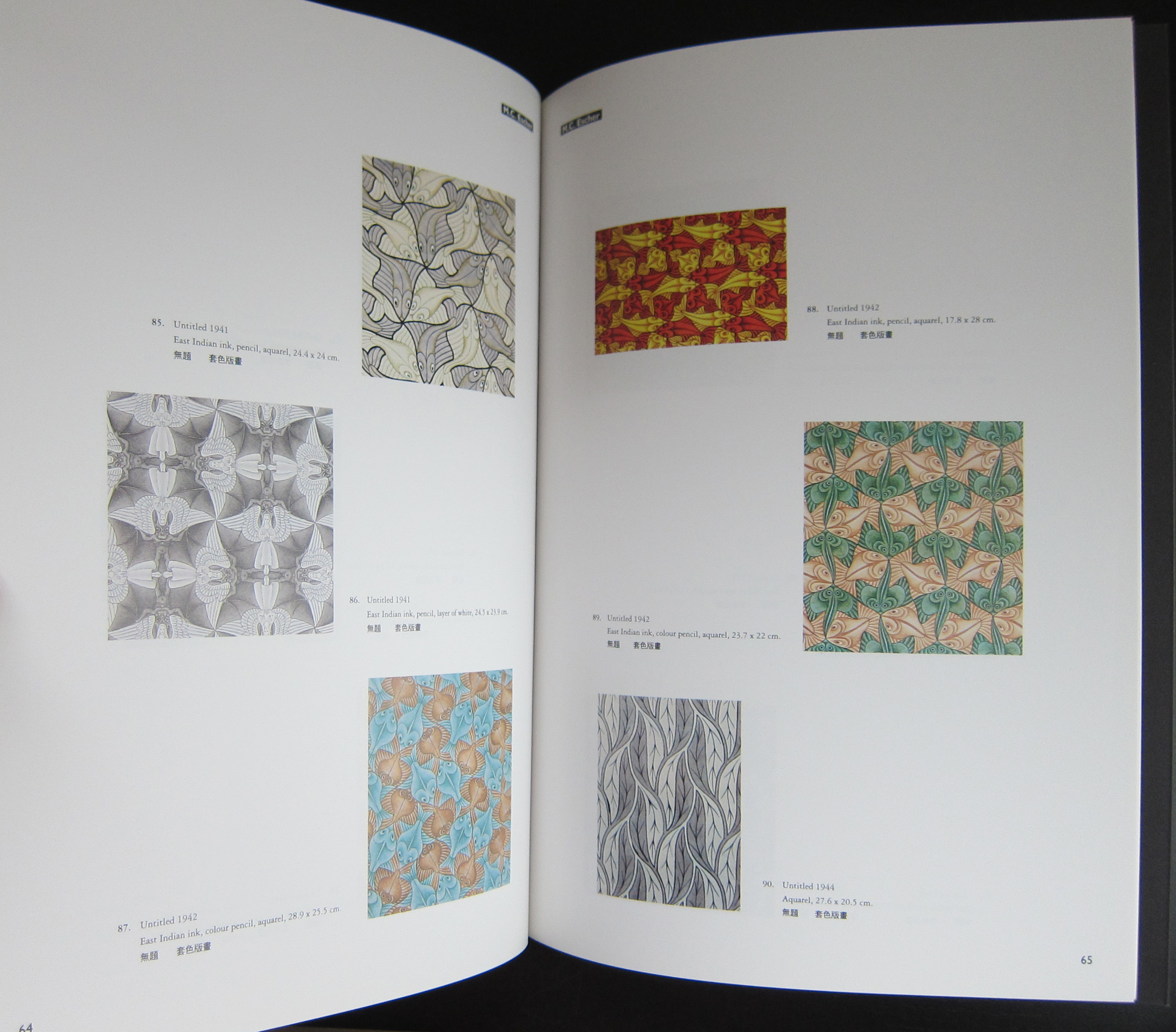 This can be explained easily, because the publications was initiated by the Fung Ping Shan museum, which is now not only a museum but also a University and Art gallery in Hong Kong. Publication by this museum are rare and it is even more exceptional to encounter one of their publications in Europe. This is one of the smaller museums in the world and i do not know how they managed to get an Escher exhibition, but i suspect it was bought from Cordon Art. Cordon Art is the sole owner of the reproduction rights of the works by M.C Escher and probably has still the largest collection of original works by the artist. It was 1994 that this book was published and what strikes me most is that the reproduction and print quality is the best that was possible in those days. The book outshines other Escher publications from that era and is possibly the best that was published on the artist in the nineties. Escher is always present in the inventory of www.ftn-books.com , but this one is rare and probably a one time offer .