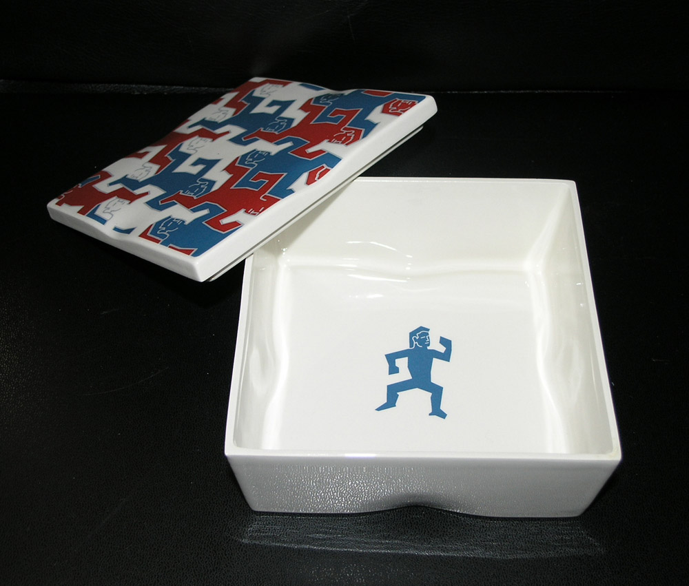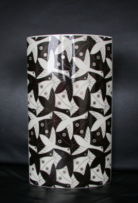 It must have been 20 years ago that the first of the limited edition M.C. Escher oval vases was published by Cordon Art. Cordon Art are the rightful representatives and copyright holders for all the works by M.C. Escher and they decided to expand this right with several editions. Of course there was the sphere which is in high demand nowadays, but there was also the very first oval vase. The Vase was produced by Schoonhoven ceramics and came with a certificate of authenticity. A limited edition of only 450 copies and all vases signed with a signature of M.C. Escher and hand numbered on the vase itself. A beautiful object and an object worthy of the design of M.C. Escher. The vase sold out quickly and inspired Cordon Art to launch several other ceramic products. Among them a plate , a ceramic box and a newly designed vase. You can imagine that these were sold out within a year or so.