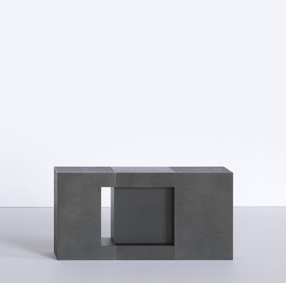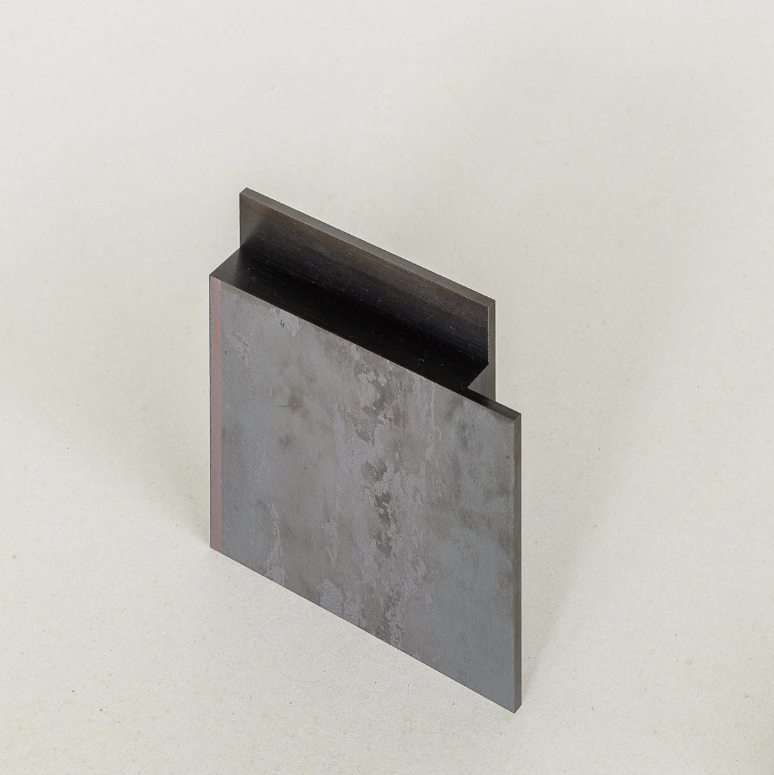 The steel sculptures of Cor van Dijk (Pernis, 1952) are characterised by clear lines and geometric shapes. From first stages of their design, the material used for these works – steel – and their realisation are inextricably linked. To create his work, the artist uses separate sheets of solid steel, which he joins together with extreme precision. Van Dijk bases the dimensions of his sculptures on the standard gauge of the sheet metal. As a result, the mill scale found on the rolled steel is left intact in the finished works.