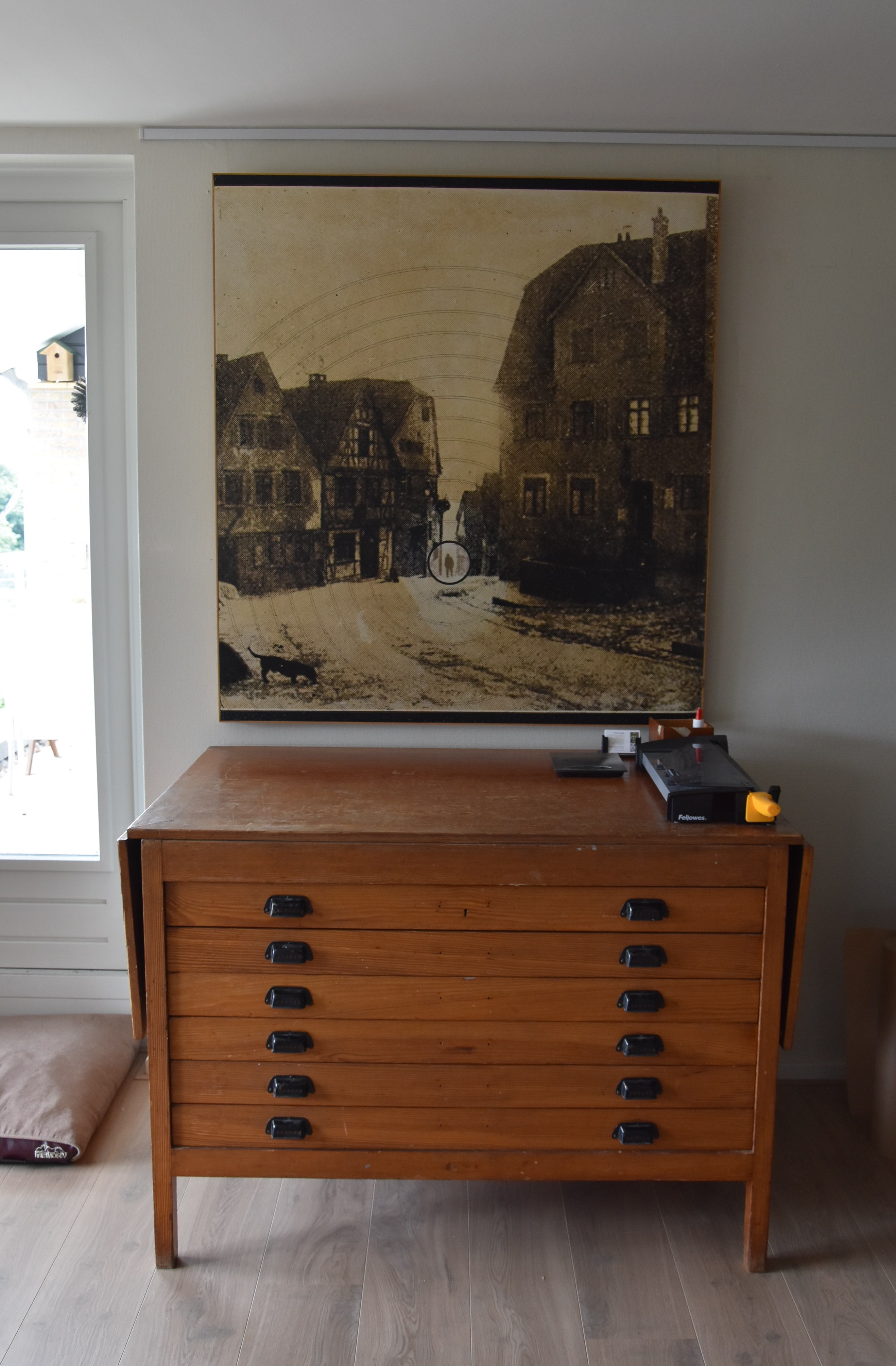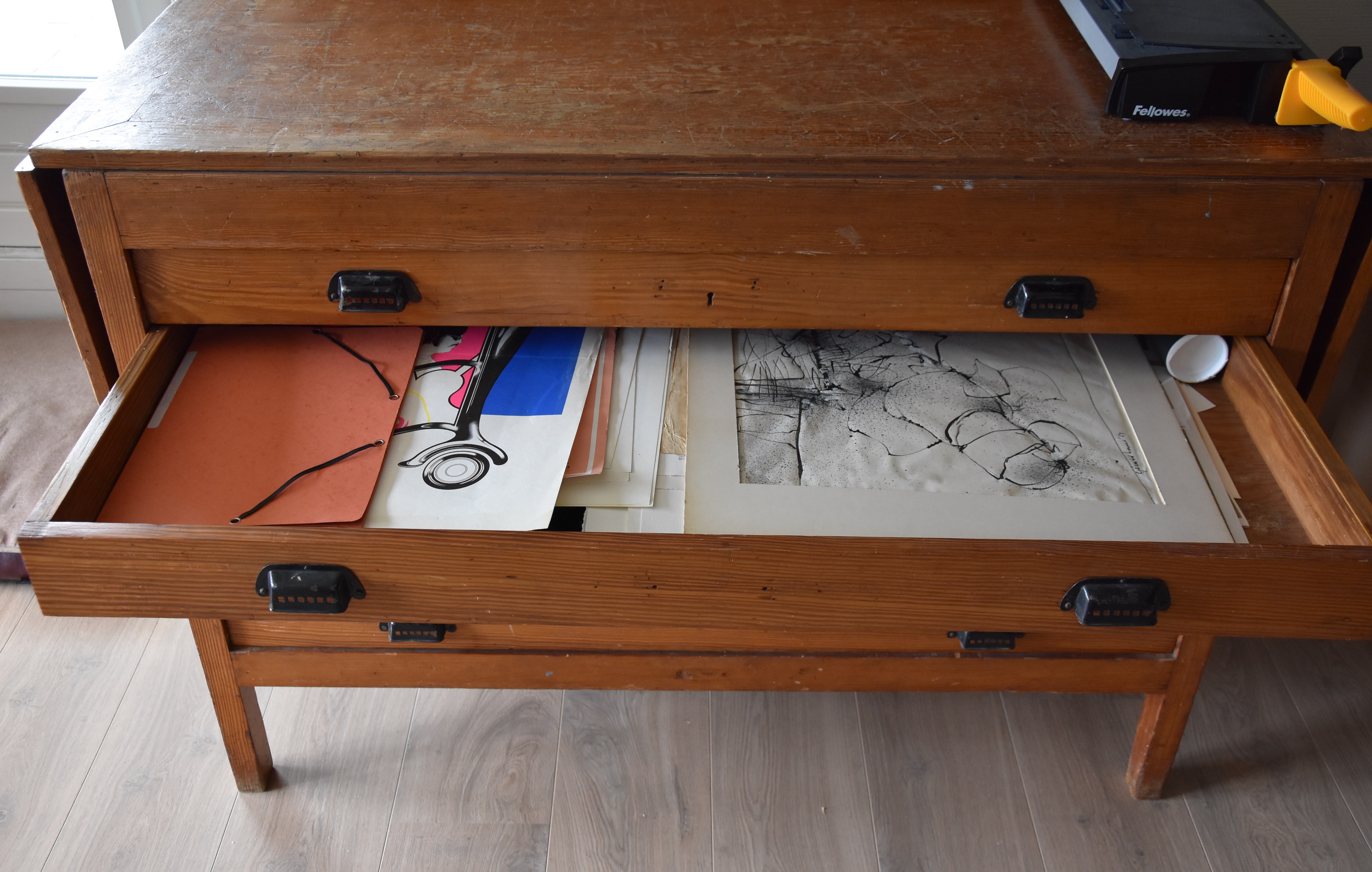 BTW. As you can see the drawing is kept/ flat in a drawer of my “new” acquisition. An “antique” drawings dresser which was formally used in a convent in Bergen op Zoom. I found this on Marktplaats and since, my offices have become much more organized . The picture above it is by Ossip (1953).