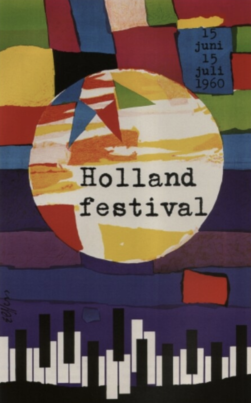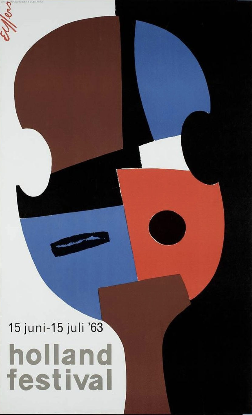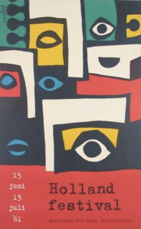 Dick Elffers is one of the great dutch designers from last century. If you compare his works , they best can be compared with the designs by Willem Sandberg. Colorful designs and sometimes they look torn figures like the ones Sandberg uses. If ever there is a combination which is known outside the Netherlands it is the designs he made for the HOLLAND FESTIVAL.