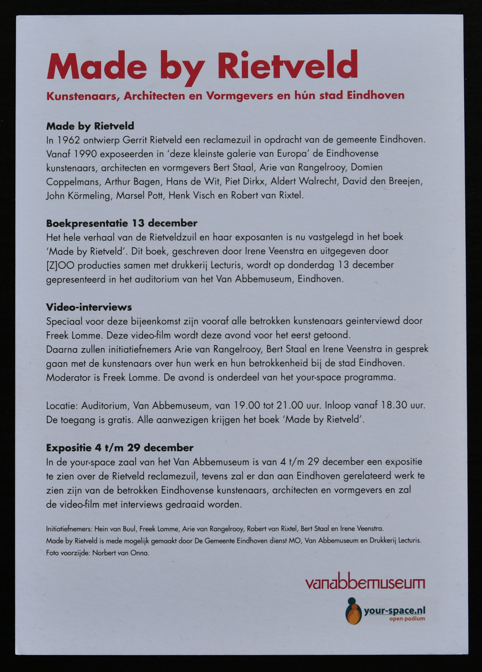 ambiguity, of under- or overstatement – and creates a lot of space for association. Words or letters are sometimes, through a clear yet abstract arrangement, made unreadable. For example, the sixteen letters of the name of the gallery ‘ P H O E B U S R O T T E R D A M ‘ are placed in a grid of four by four letters on the facade of the building in which the gallery in housed. Text as starting point and secret language, a labyrinth to wander around in, a place where you can stand still, think and dream.