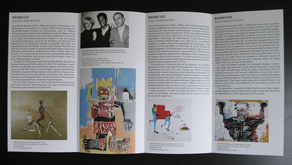 This is the exhibituion i remember most of all the exhibitions we visited during the last decade. It was a “one of a kind” event, which will never be repeated at such a scale. The exhibition covered over 100 Basquiat paintings and certainly not the smallest of them all. The entire FONDATION BEYELER ( except the Giacometti/Monet room) was devoted to one of the greatest of all painters from the 20th Century. At the time i had the foresight to take some extra Beyeler publicity folders with me and now i have decided to sell 3 of those to collectors. For this original publicity folder please take a look at www.ftn-books.com