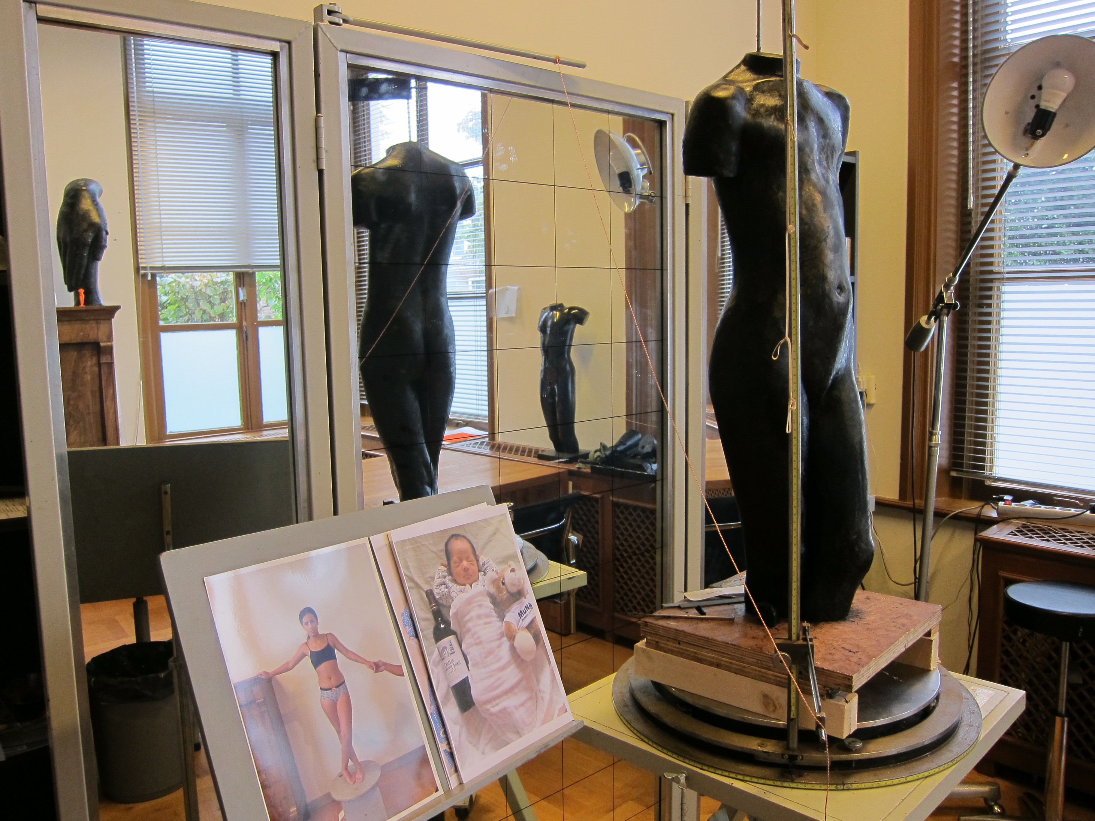 I never knew she was a gifted photographer as well , but she explained that she made photographs during the time she had a shoulder injury and it was almost impossible for her to sculpt. The Large JCJ van der Heijden was the remainder of an exhibition which was one time held in the gallery. An extremely organized studio, with a special spot with mirrors to make the sculptures. The one that she was busy with was modelled after a photograph and in most cases Eja uses photographs to model after. Eja explained that the editions of the sculptures is protected by french law in which is stated that the maximum number of sculptures which is allowed to be made from one cast is eight. Above this number one speaks of an edition which of course can be limited too.