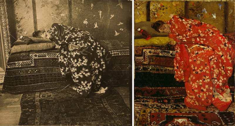One of the first times i visited the Rijskmuseum and the Stedelijk Museum i encountered this beautiful woman, lying on a couch, wearing nothing but a red japanese kimono. Everything is the paintings was new to me. Dutch impressionism, the loose touch with the brush, the high details and the sensuality in the painting made it beautiful to me. What i did not know at that time, is that Breitner was one of the first to use photography as a start for his paintings and this girl in a red kimono ( name was Geesje Kwak , a famous model at that time) would be painted in many versions and depicted on many paintings. There are “Red Kimono” paintings in the collections of the Rijksmuseum, Stedelijk Museum, Museum Twenthe, Teylers Museum. A few years ago there was this exhibition in the Rijksmuseum on all these versions of the girl in the red kimono. Unfortunately i did not visit it , but i still have some excellent catalogues on Breitner available at www. ftn-books.com and study this wonderful painting.