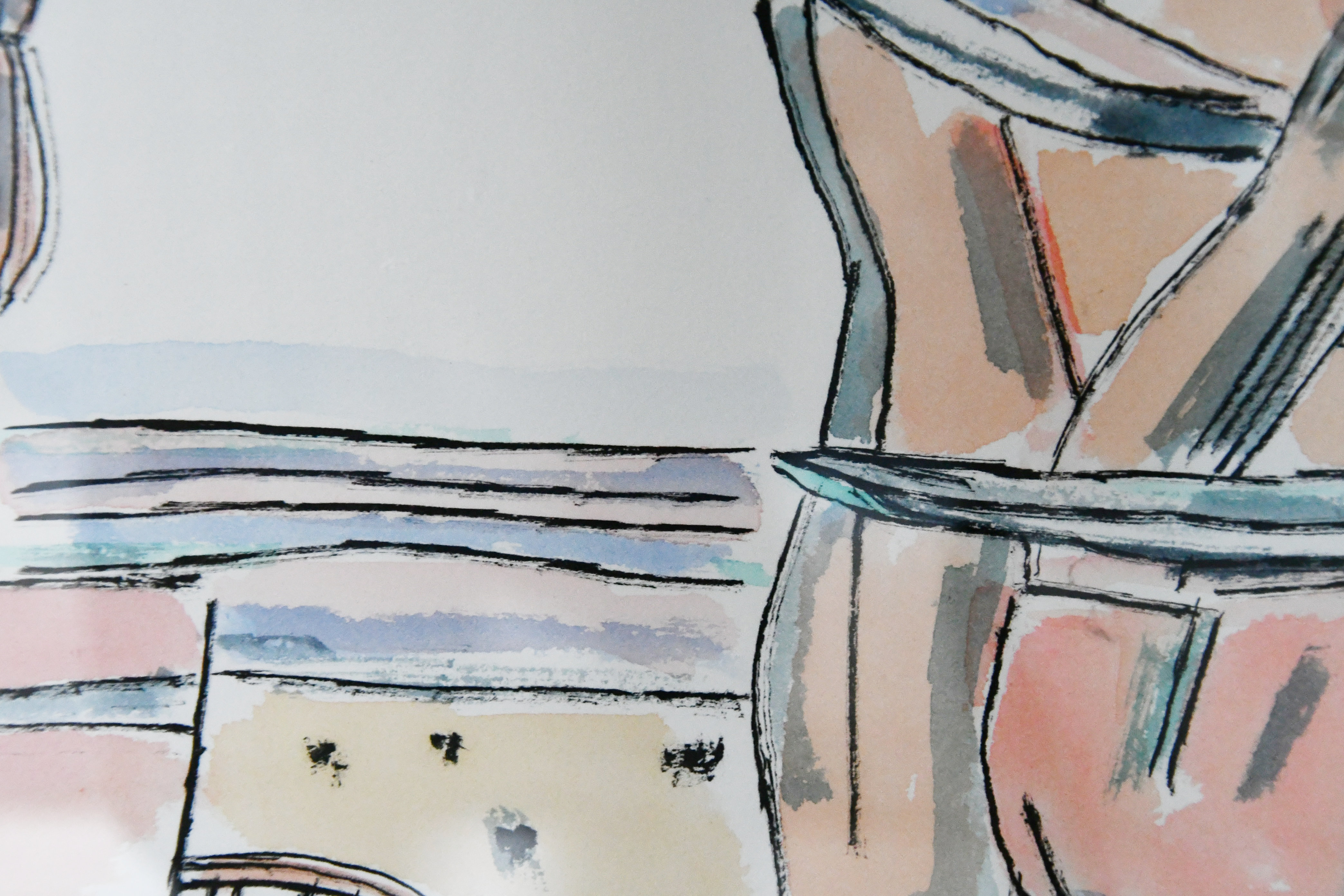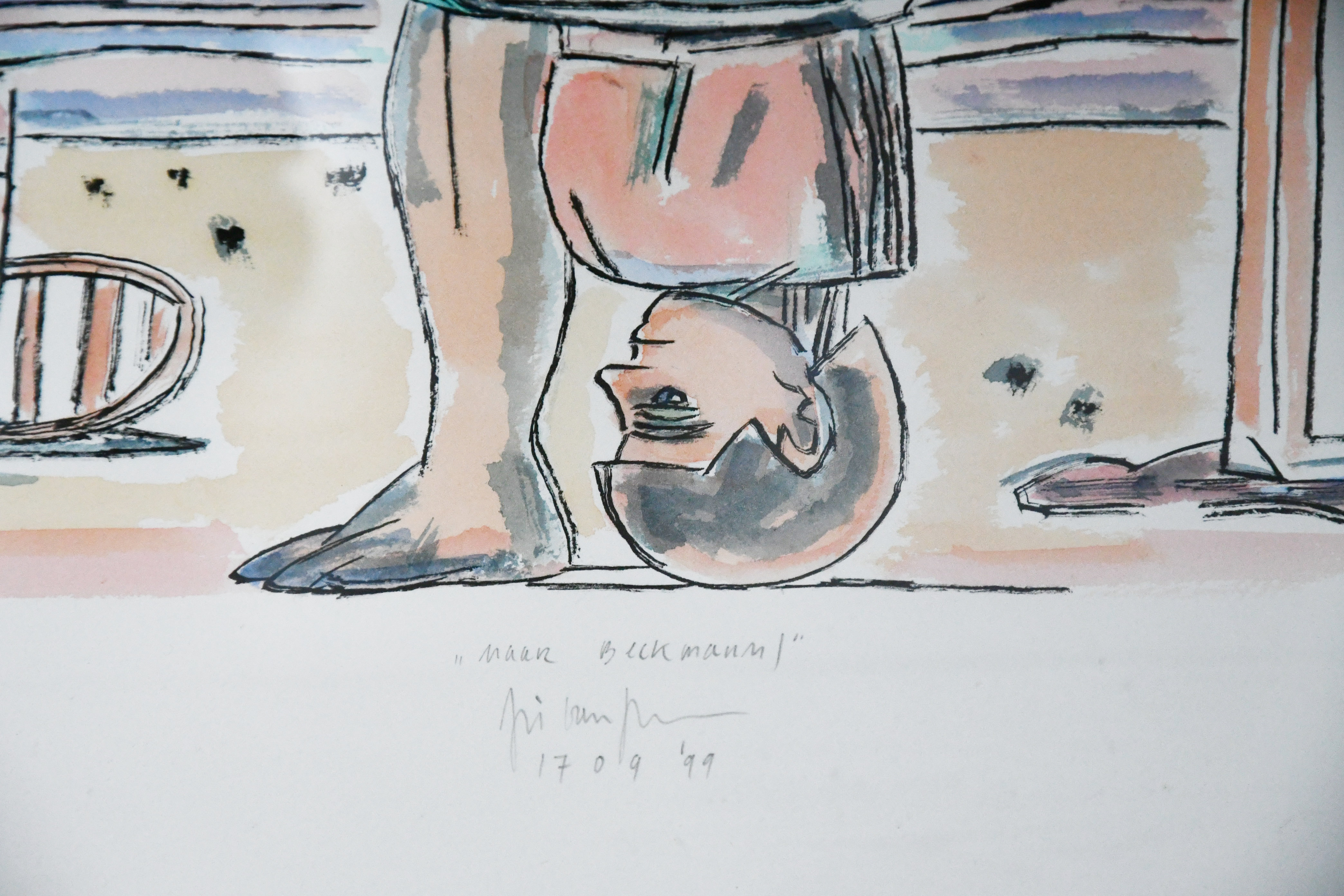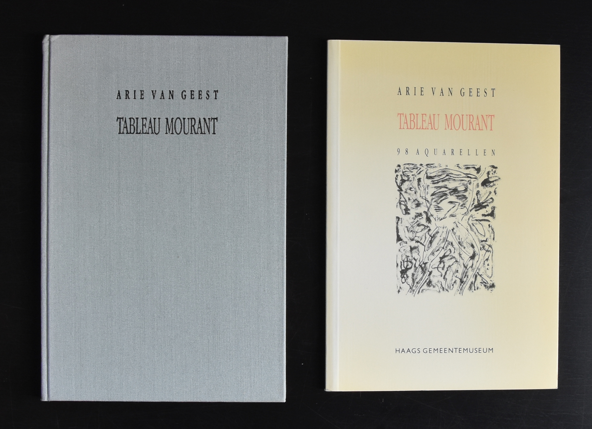 Without realizing i have collected a beautiful small collection with works by Arie van Geest. Born in Maasland he stayed in the region and had several studios in Rotterdam. The friendship with Pat Andrea shows in his early works which were a little surreal, but in the mid eighties he changed in the approach of his painting. His works became abstract with realistic elements and that is the time i met Arie and bought my first drawing. Together with Mariette Josephus Jitta, as the curator in charge, he made the Tableau Mourant exhibition in which 98 watercolors were shown. This series was later bought by the van Gogh Museum. For the exhibition in the Gemeentemuseum 2 editions were made. One “ordinary edition” designed by Paul Stoute and the other a linnen bound one, with a drawing/watercolor by van Geest.