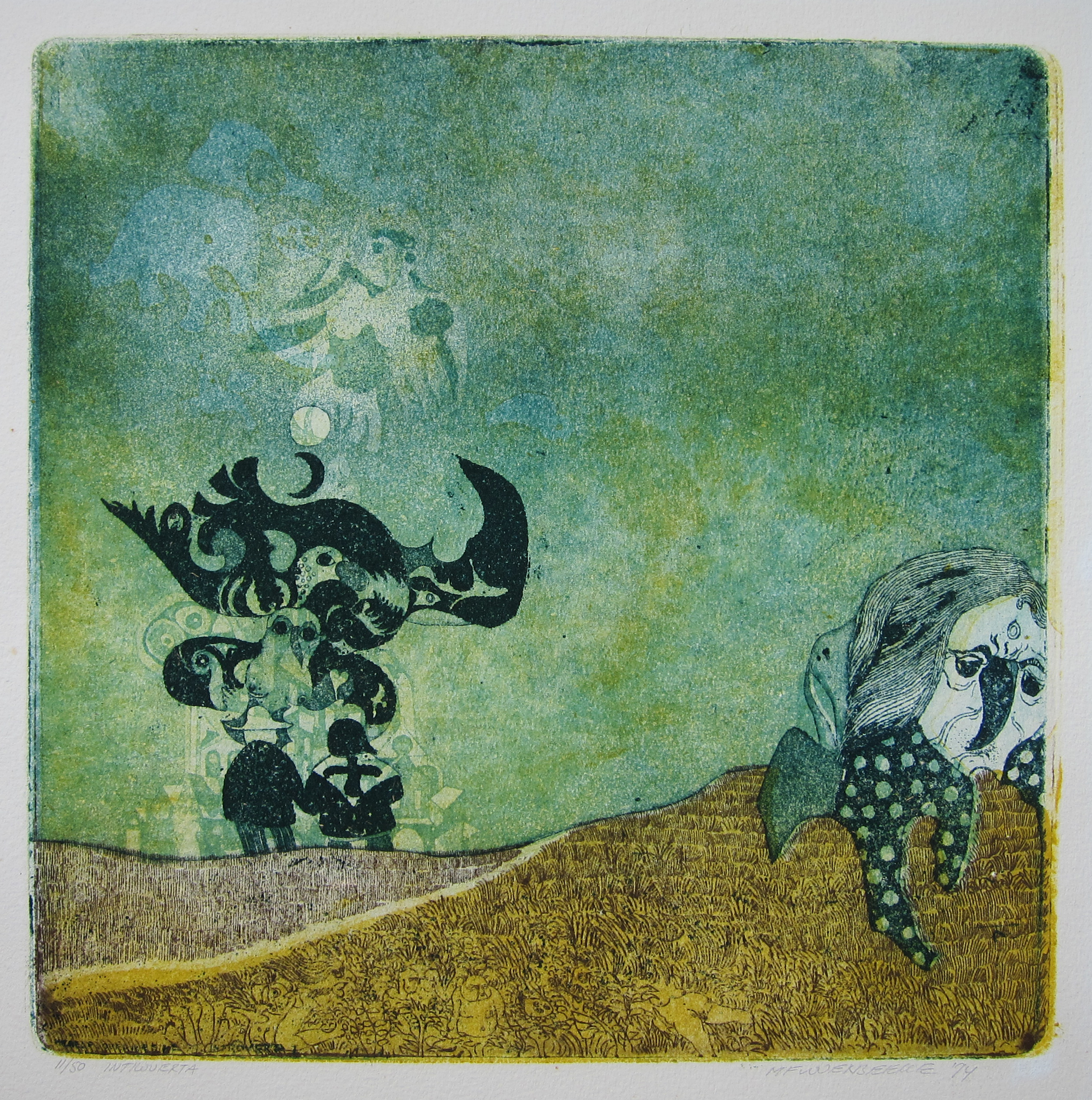 One of the first graphic works i bought from my pocket money some 45 years ago was a set by Michel van Overbeeke. An artist who had his works sold by ARTA in Den Haag. Arta is no longer there. It closed it’s doors some 30 years ago, but they had a system in which they had members and made the works they commissioned with artists, available to their members. For as little as 25 guilders you could buy an original piece of art. It was in the early seventies and i was impressed by a set on the I TJING . van Overbeeke made this visible in enchanting scenes with many of his characteristic figures. van Overbeeke never changed his style very much and always stayed true to this very personal style of graphic art. He also made paintings but his strength is in his graphic work. Always small editions and in general well beneath a 100 copies printed by hand. Always signed and numbered in pencil. And sizes not bigger than 70 x 50 cm. He printed his etchings himself, colored them in many cases by hand and build a strong circle of admirers through the decades which followed the seventies in which he became quit known in the Netherlands and abroad. Sometimes these works are offered at auction. What strikes me is they are never held up and they always find a buyer. Look at these works yourself at www.michelvanoverbeeke.nl and see the “magic” of this artist. and for those looking for the book that is nowhere to be found………..
