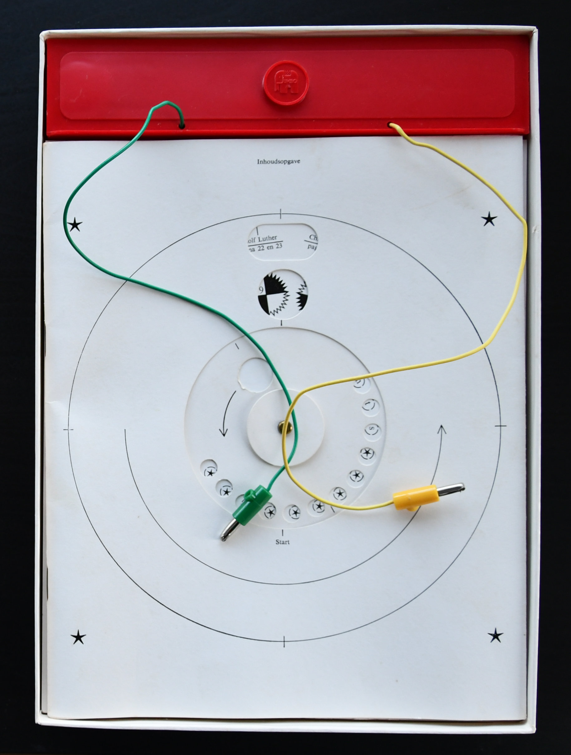 Imagine the old dutch game of ELECTRO . You habe to find the right combination between question and answer and than the light will light up when the answer is correct. This was the idea behind the play catalogue Swip Stolk designed together with Frans Haks for the ENVIRONMENT exhibition they organied in 1968 fro Studium Generale Utrecht.
