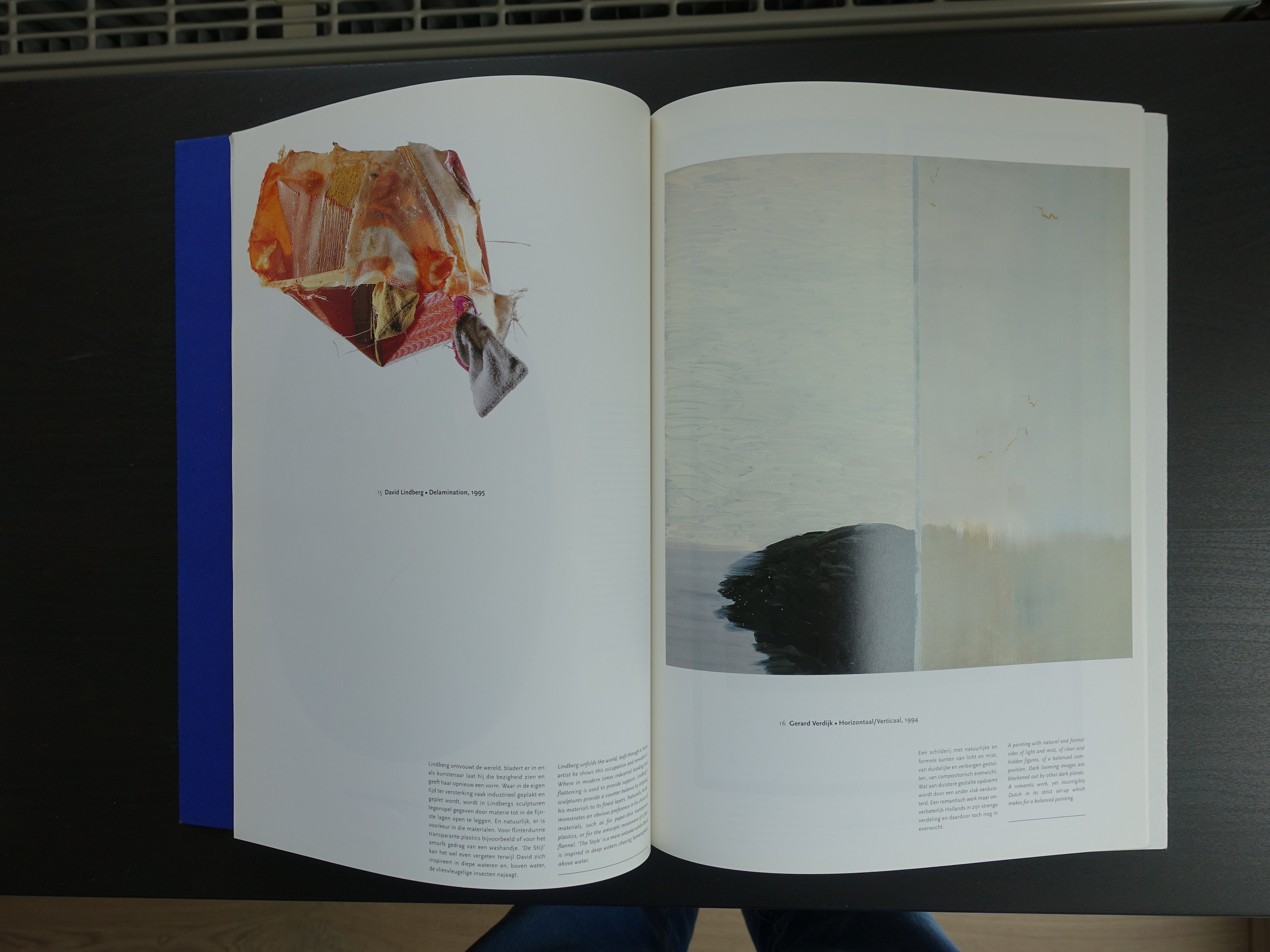 Readers of this blog know of my admiration for Gerard Verdijk and did not hesitate a single secoond when in 2011 a very large painting by Verdijk was put up for auction and did not receive its first bid. It appeared to be the winning bid and since the moment this painting entered our home it has been on display in our living room. The painting was part of the Peter Stuyvesant collection but a decade ago the staff of the Turmac Tobacco company and the founders of the Stuyvesant foundation decided to sell their collection. This collection is very well documented and from its earliest of beginnings the best dutch designers made the catalogues which documented their additions. I knew almost for certain that our paintings was in one of these publications but i never found the right one, but…..i now have it and i am very pleased that our painting is prominently present in a beautiful large catalogue, designed by Anton Beeke …and the title of it is “GROOT” in de collectie Peter Stuyvesant.