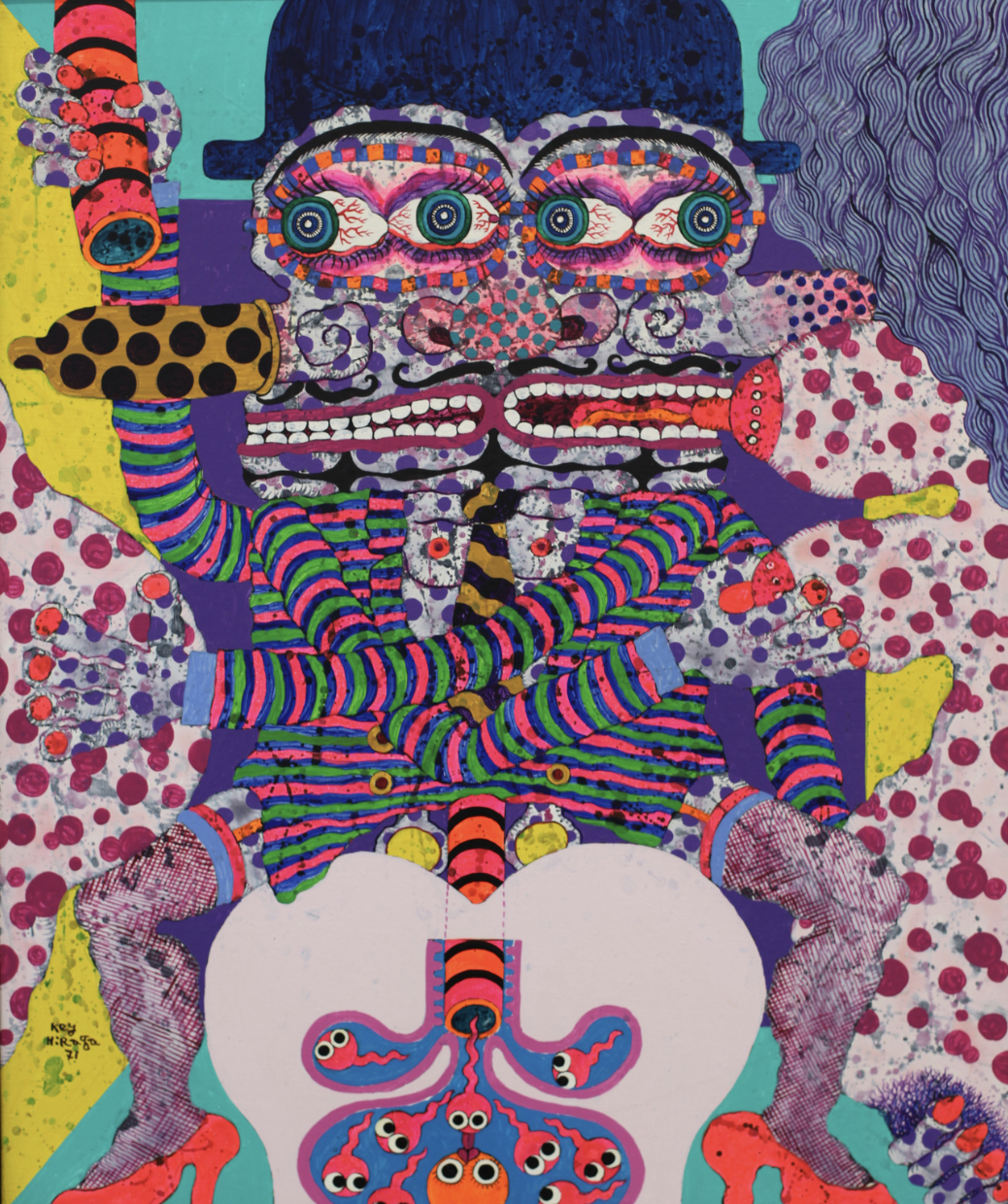 Rooted in Pop Art and Hippie art, this symbiosis of these influences in the art of Key Hiraga created an original approach to subject and painting itself. These paintings are one of a kind and can be immediately recognized for being done by Hiraga.