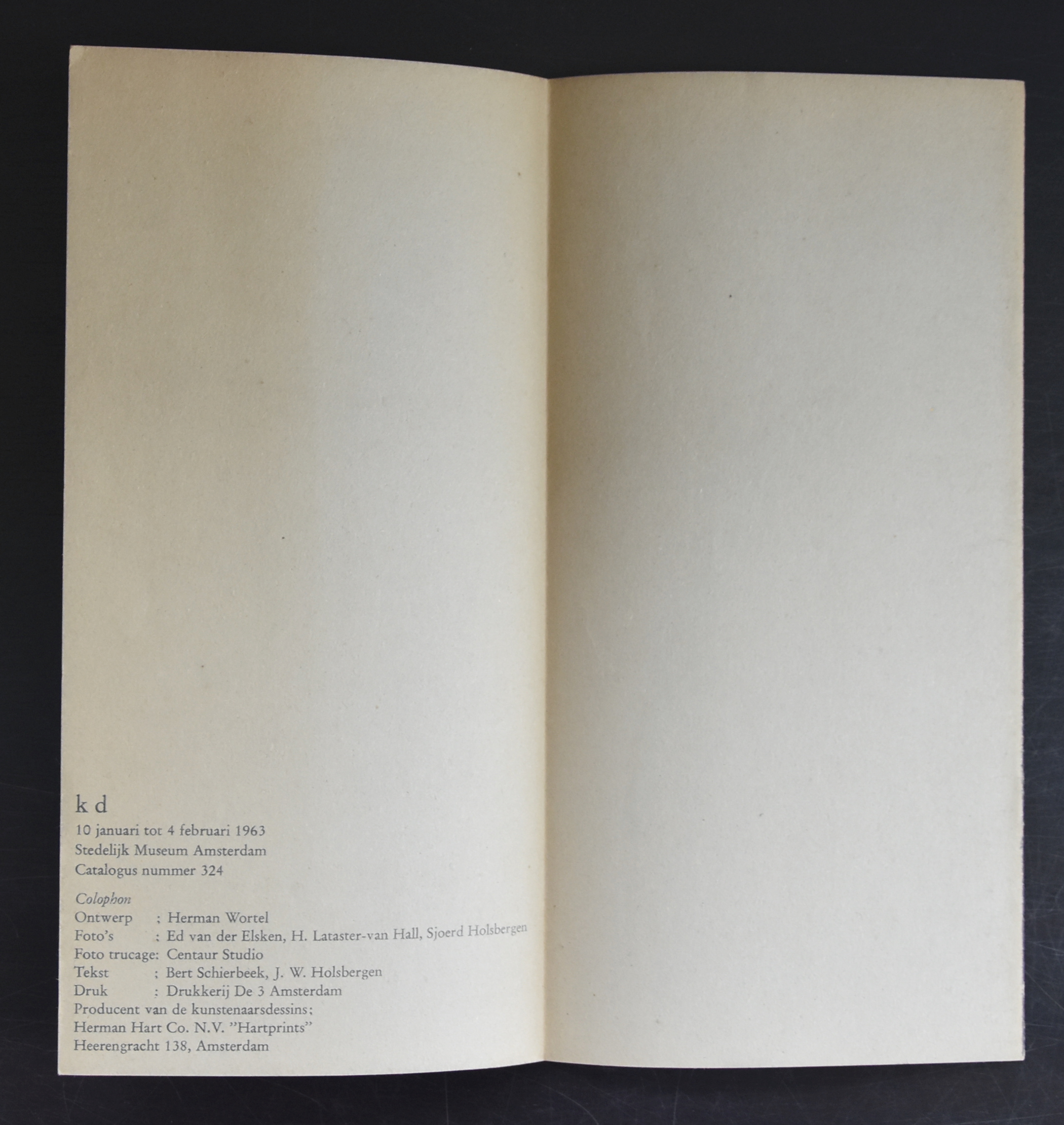 The artists? …Karel Appel, Jef Diederen, Ger Lataster and Dick Elffers. These four made some wonderful designs which were presented in the KD exhibition. With the exhibition a catalogue was published in 1963 which has become one of the rarest of Stedelijk Museum catalogues of all time. Three reasons why this has become rare. Less than 500 copies were made. The paper used was fragile and it was a thin catalogue of only 12 pages and folded and last but not least…. the photography was done by Ed van der Elsken which made the remaining copies desirable and collectable. Still at least one copy is still on the market and available at www.ftn-books.com