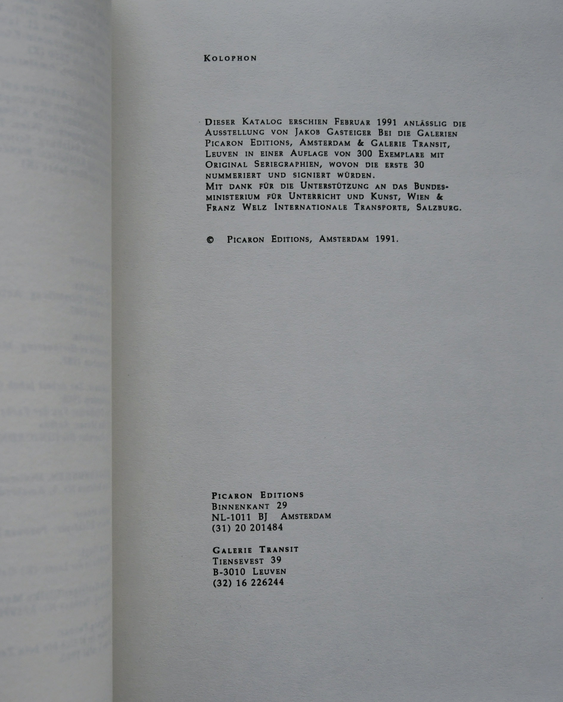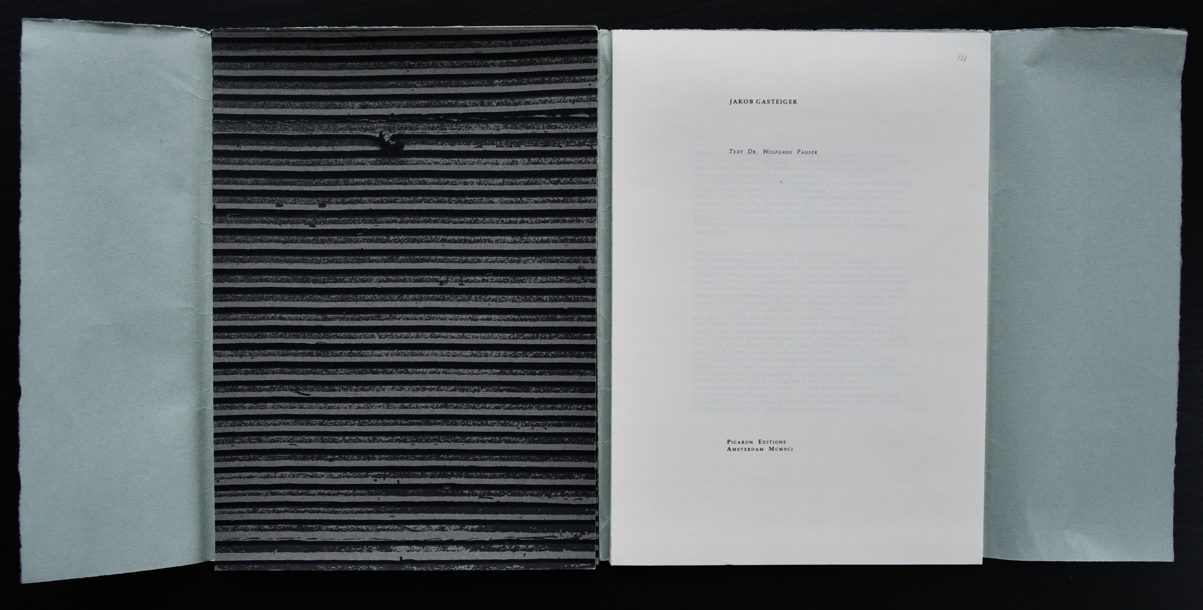It must have been in 1991 that i first encountered the publicatiions by Picaron editions. Among them was the Travel to Rome portfolio by Marc Mulders . On this specific item i wrote a blog some 2 years ago. Now it is time to devote a blog to another of their publications. The Jakob Gasteiger portfolio which was published in an edition of only 300 copies. It contains 8 special prints and certainly is one of the rarest of all Gasteiger publications and now finally for sale at www.ftn-books.com