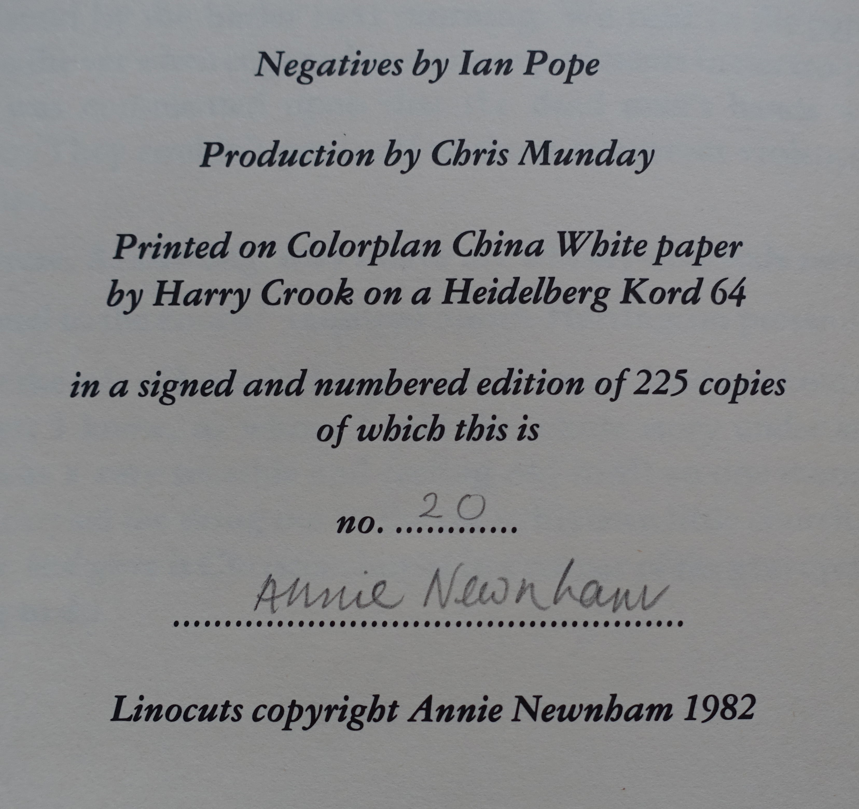 Newnham studied at the Royal Academie of Arts and has since build a reputation as an illustrator. Works are sold regularly at auction , but i could not find any results of this 46 page publication which contains 9 original lino cuts and was published in 1982 by the Inky Parrot Press in a numbered and signed edition of 225 copies. The atmosphere makes me think of the DIE BRÜCKE group of german artists whit dark blacks and atmospheric scenes. I only can highly recommend this publication to all collectors of artist books.