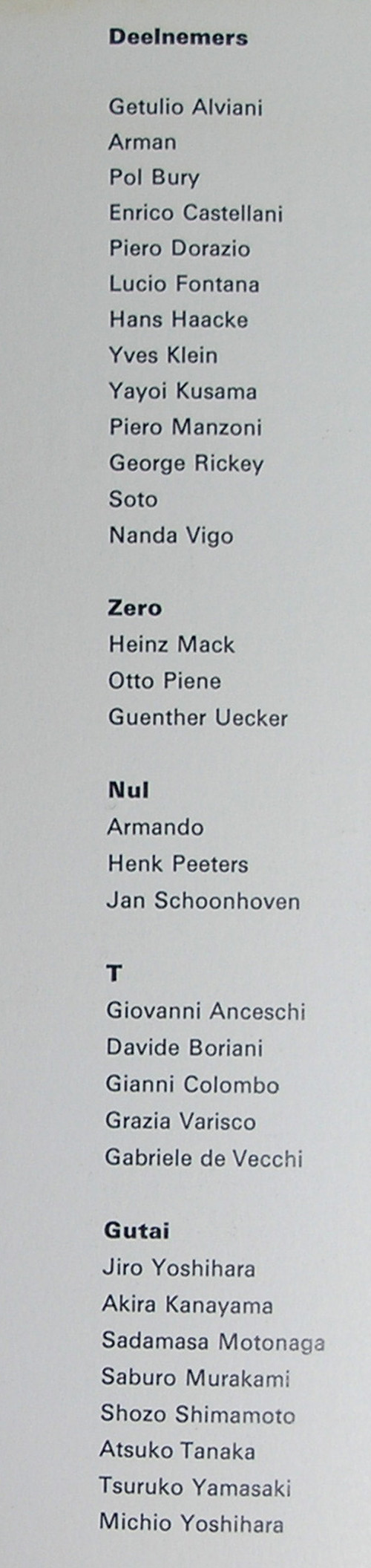 Peeters was a spider in the web of the international ZERO movement of the 1960s and it was thanks to his efforts that the big Zero/Nul exhibition was held in the Netherlands (partly at the Gemeentemuseum in the The Hague, the city where the Nul group enjoyed its heyday). He disseminated and published Nul and ZERO manifestos and even today is an important source of information for researchers and writers concerned with the history of ZERO and Nul.