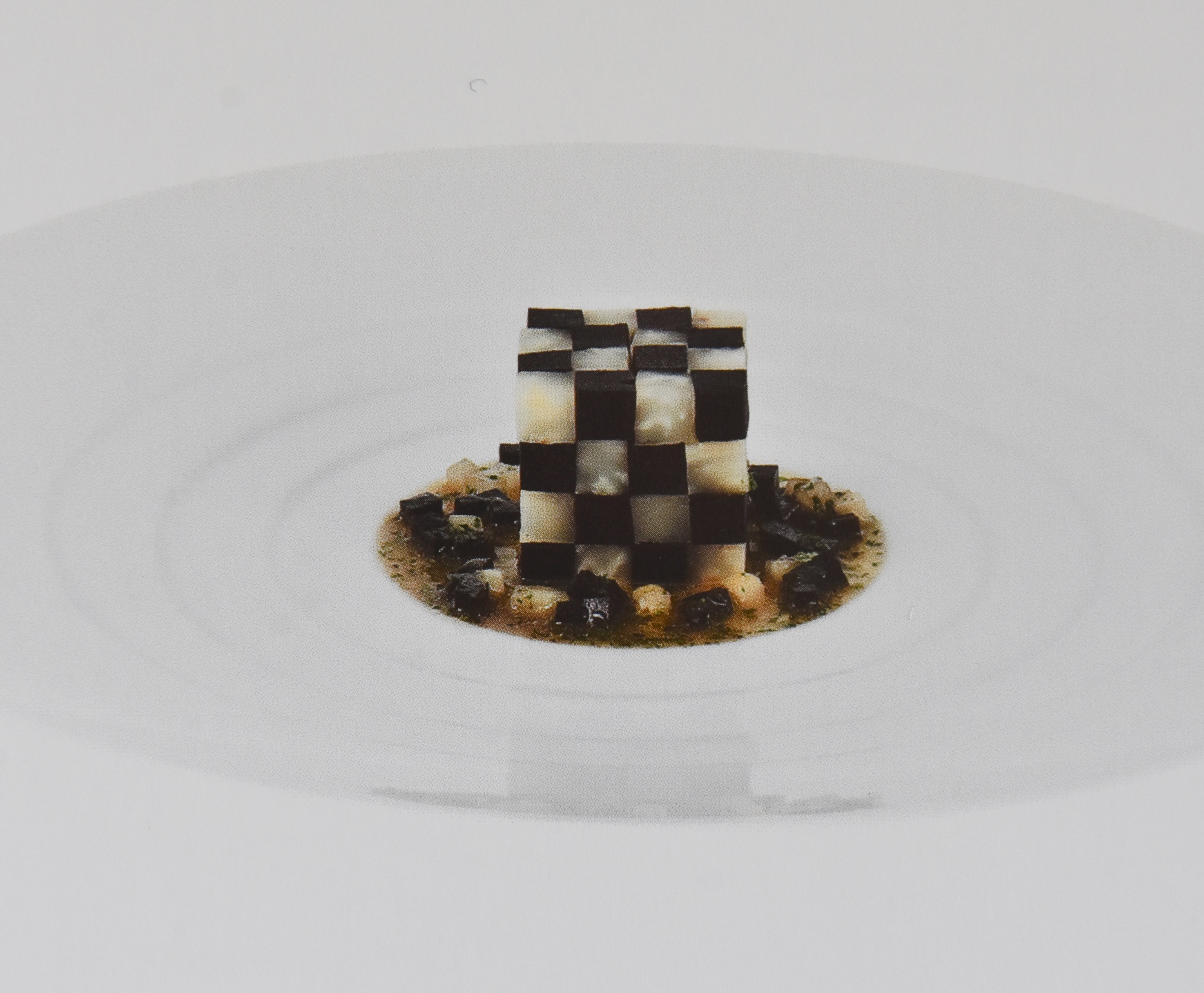 I had the very strong impression that this great chef is inspired by art. Not the taste of course ( which is by the way exquisite), but the plates look all like small pieces of art and go way beyond the regular way in making up a plate. another example is the “amuse” of mackerel which reminded me of a very small painting by Fiona Rae which is available at www.ftn-books.com.