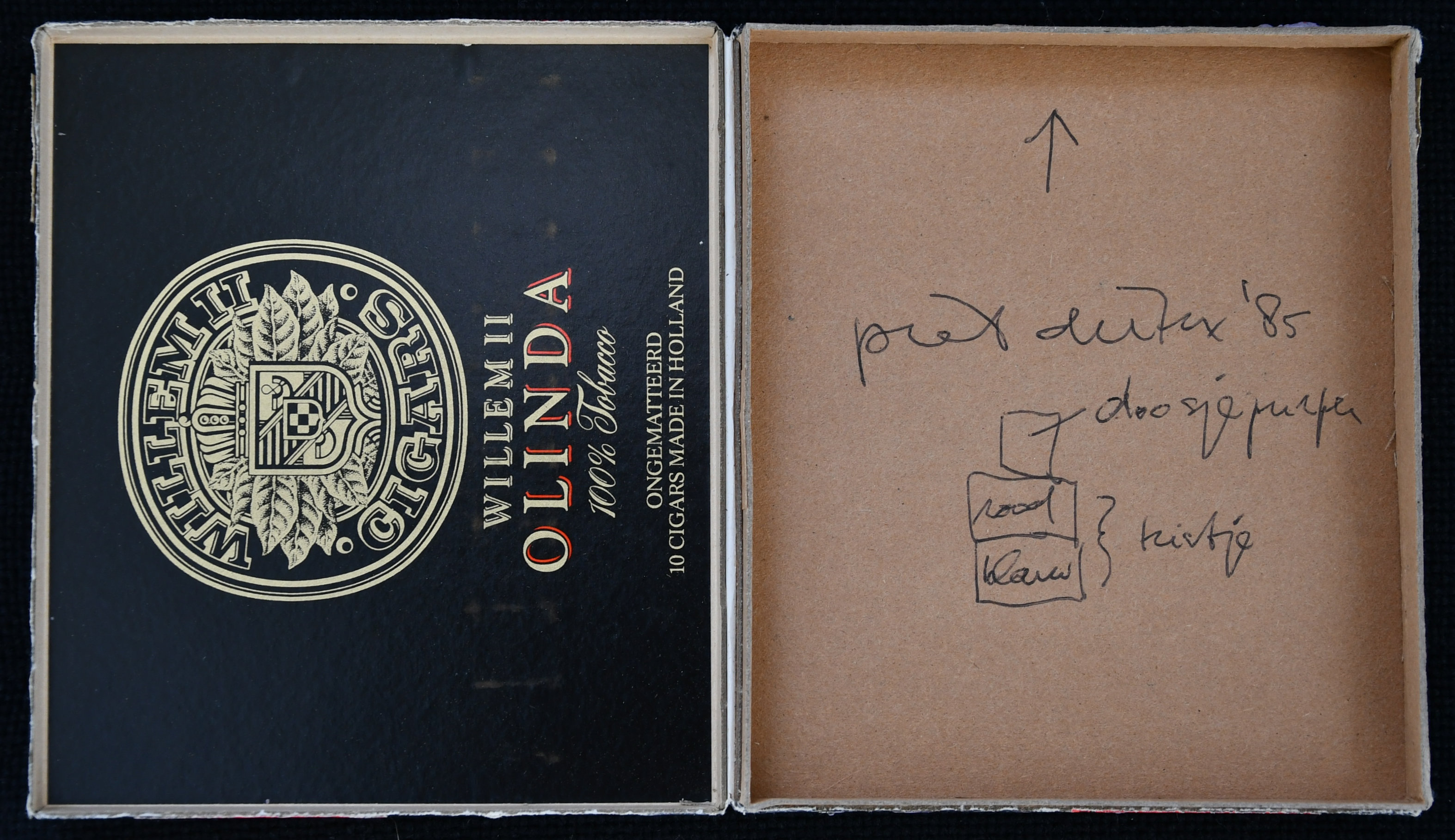 On the 1st of September 2016 i started the “Piet Dirkx daily” with the publishing of a Piet Dirkx cigarbox on each day since. There were over 850 cigarboxes that were once part of the installation Biotoop at the Gemeentemuseum Den Haag. This publication of the collection of cigarboxes has come to an end. That does not mean that the Piet Dirkx daily will not continue. Yes…. it continues ….however the frequency will be different. Every week on Saturday or Sunday a new “classic” Piet Dirkx item will be published, but this time it will be mostly very colorful larger and extreme large items. Drawings, paintings and special publications all other parts of my/our collection will eventually be published.
