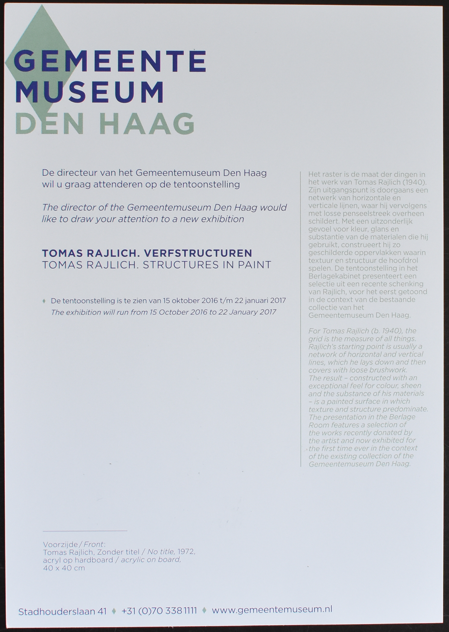 Painting was declared dead in the early 1970s. Tomas Rajlich (1940) opposed this notion and revived painting by making the act of painting itself the subject of his canvases. In 1975 he was one of the most important exponents of Fundamental painting: a collective term for works in which idea and materials are inseparable. Rajlich still considers himself a Fundamental painter and has continued to develop as such to the present day.