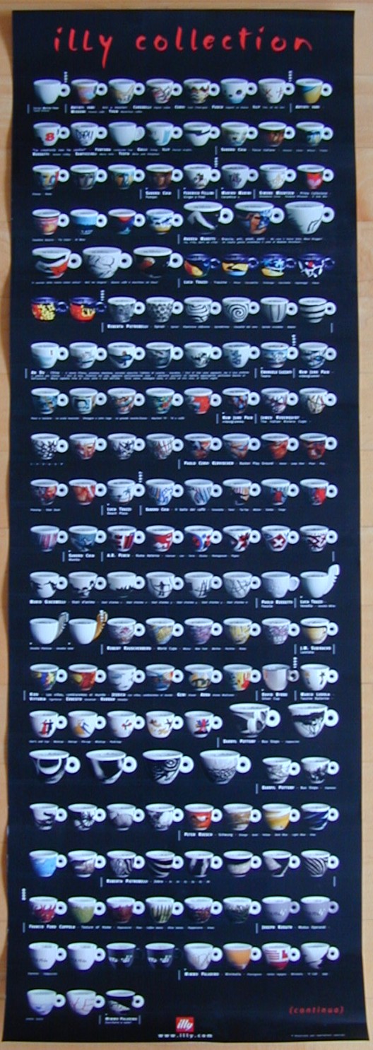 About 20 years ago Illy, the Italian coffee producing company started with their Illy collection. A prestigious collection of (espresso) cups, produced in limited editions in which they invited contemporary artists to paint and decorate their Matteo Thun designed illy cup. Since , over 100 editions have appeared in their series of art designed cups. Great names in Modern art, Fashion and design contributed to the series. Koons, Rauschenberg, Penck, Thun, Pistoletto, Bourgeois, Fabre and many others have made their appearance in the series of espresso and cappuccino cups. For those who started their collection around 2000 some great names were there to be picked up and the editions from that period belong to the highlights in many Illy collection. www.ftn-books.com still has some nice series available with their original boxes and of course never used. The illy coffee can was in most cases removed, because it was well passed its expiration date , but the cups are timeless and will grace any collection.