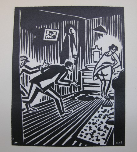 The logo comes from a story which is told in 63 small woodcutprints . I chose this print because of the subject ( a man holding and reading book in a forrest) and because it is by Frans Masereel. I love Masereel…not only his technique but also he was one of the first who told a complete story, like a comic, by putting is sequence approximately 100 woodcuts after each other. Published in a smaller sized pocket book size these stories were highly portable and could be “read” within 10 minutes….but this was not the end of the story, because when you study the woodcuts within the publication you will discover different layers within the woodcuts. Masereel was a craftsman pur sang, but he could also tell stories with pictures a great artist of whom there are several publications available at www.ftn-books.com