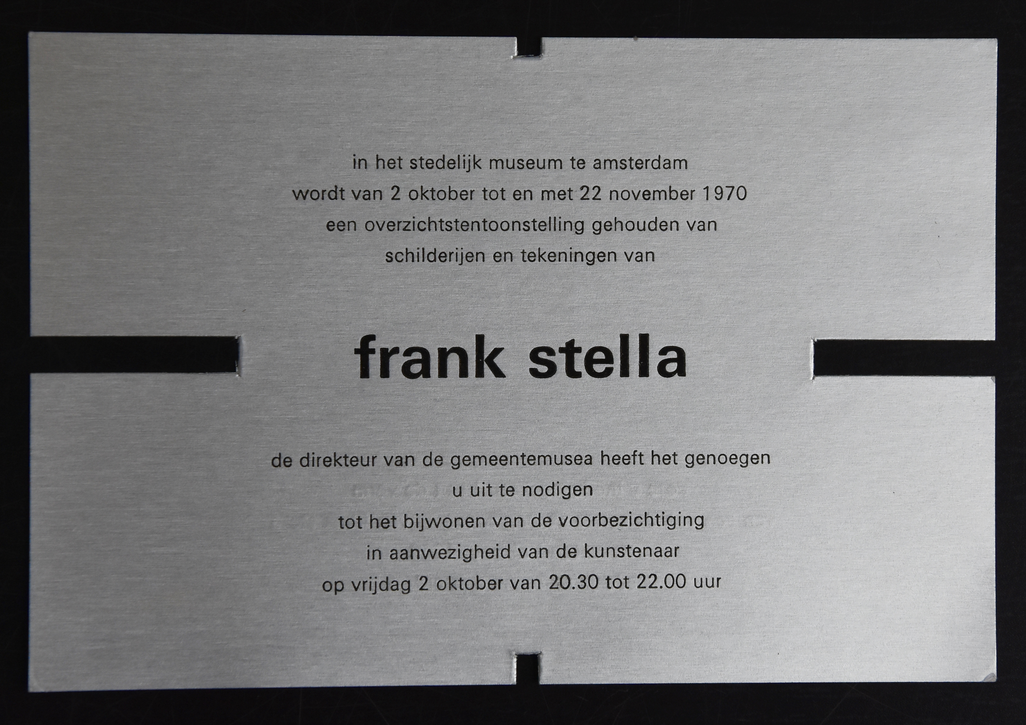 Frank Stella became a celebrity in the early Seventies in Europe , where exhibitions were being organized all over Europe. Among them, his exhibitions in Zurich and Amsterdam where on both occasion were his V series exhibited. The difference?…. in Zurich these works were for sale and in Amsterdam they only were on show, but what makes thgis exhibition fro me more special is that with the exhibition a wonderful Wim Crouwel designed catalogue was published .