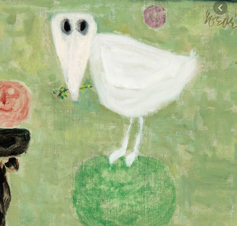 One of my personal favourite painters is Jan Roëde. Not very well known outside the Netherlands, but in the Netherlands, he has build a name for himself with frequent gallery and museum exhibitions. One thing I want to share with the readers of this blog is the frequent return of some elements in his paintings. Children, parents and some animals are to be found on his colourful paintings, but the one I like personally most is this “bird he puts in many cases next to his signature.