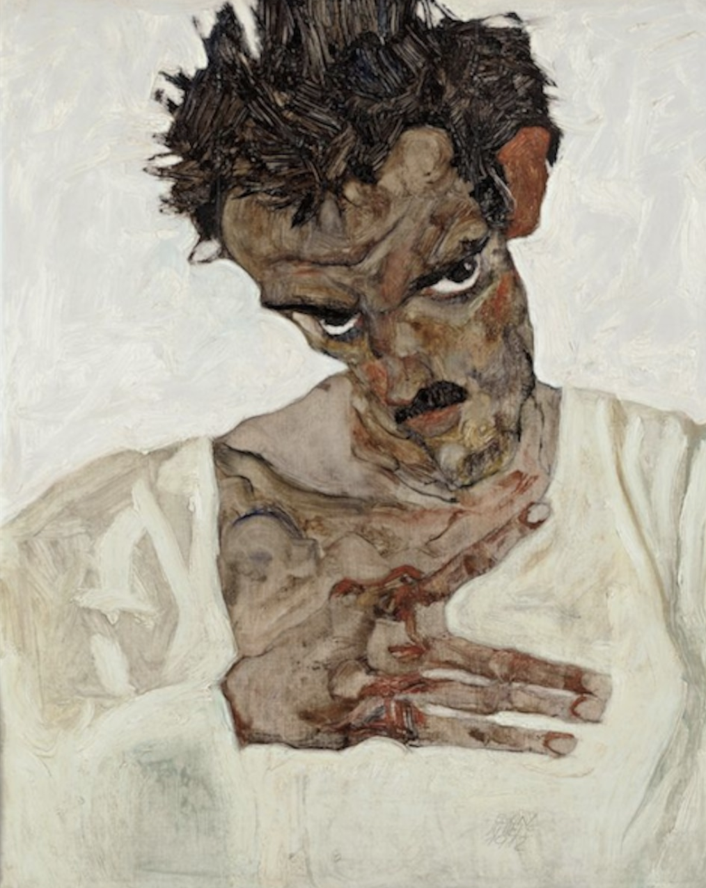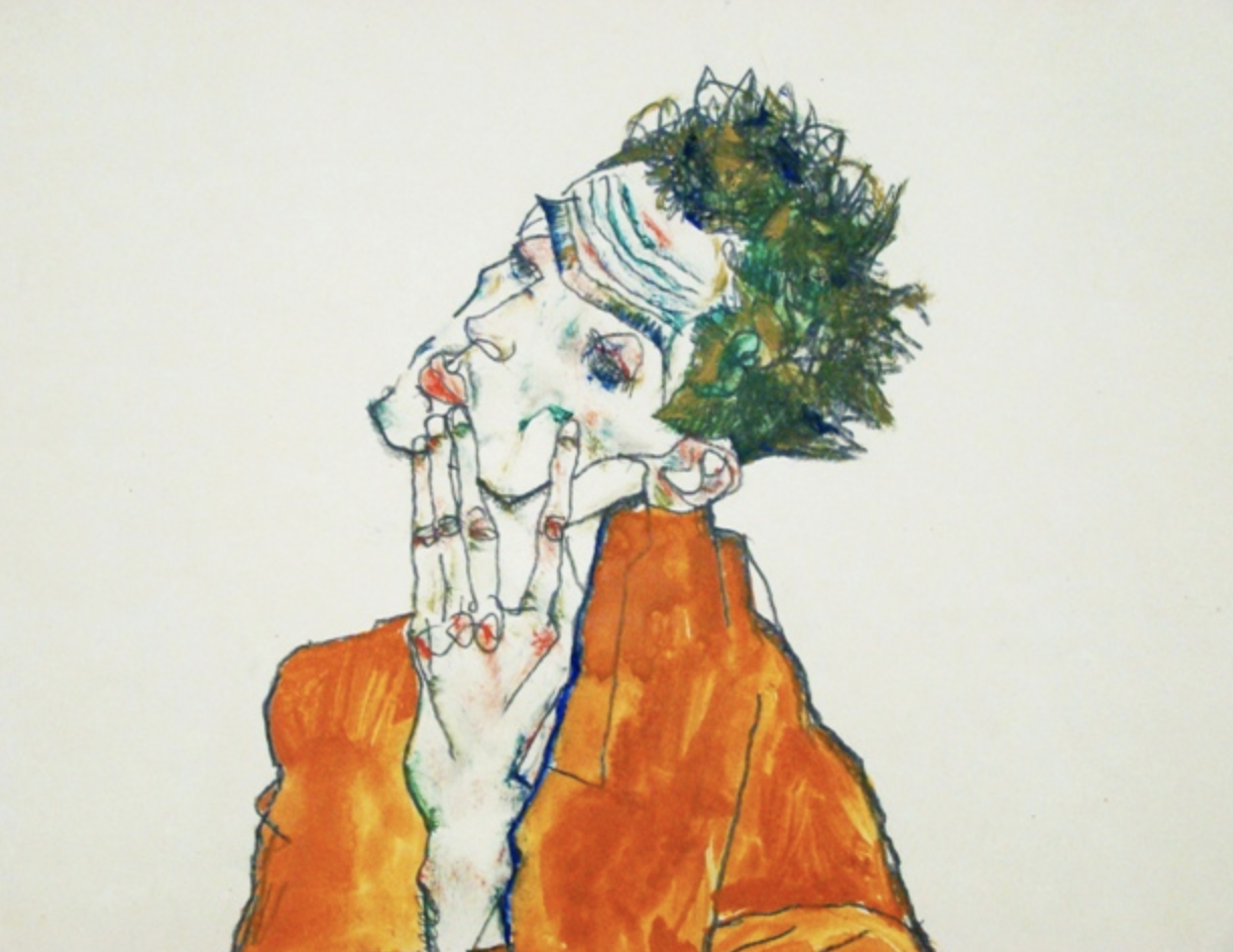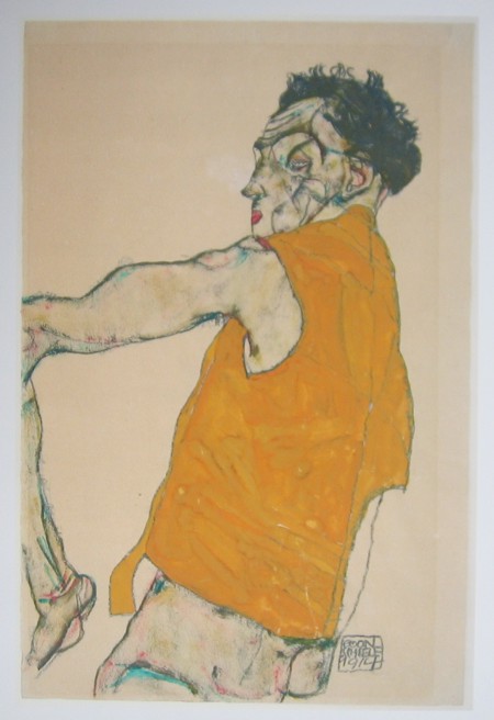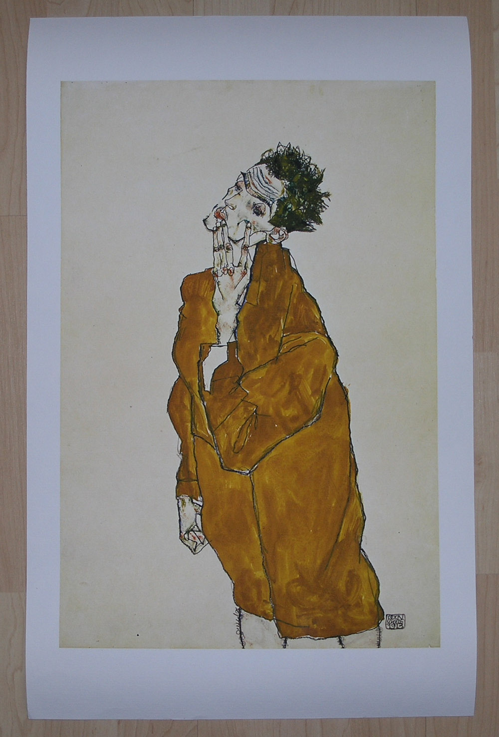 Yesterdays blog inspired me to write a blog on the self portraits of Egon Schiele. Schiele himself was his most reliable model and in the short period he made his art he always made studies of himself and really stroke a pose.  Studies of his head and studies of full length figures all show the different poses he took. In many of these studies/portraits his head or body is distorted in some way making the pose exceptional and really typical for Egon Schiele. Some of these selfportraits are available through www.ftn-books.com. I bought these at the time there was a “Schiele Klimt Klee” exhibition at the Gemeentemuseum Den Haag and these prints were made according to the highest standards by the printshop of the Gemeentemuseum. Best of all …their size is 1 on 1 with the original drawing which makes the print almost perfect.