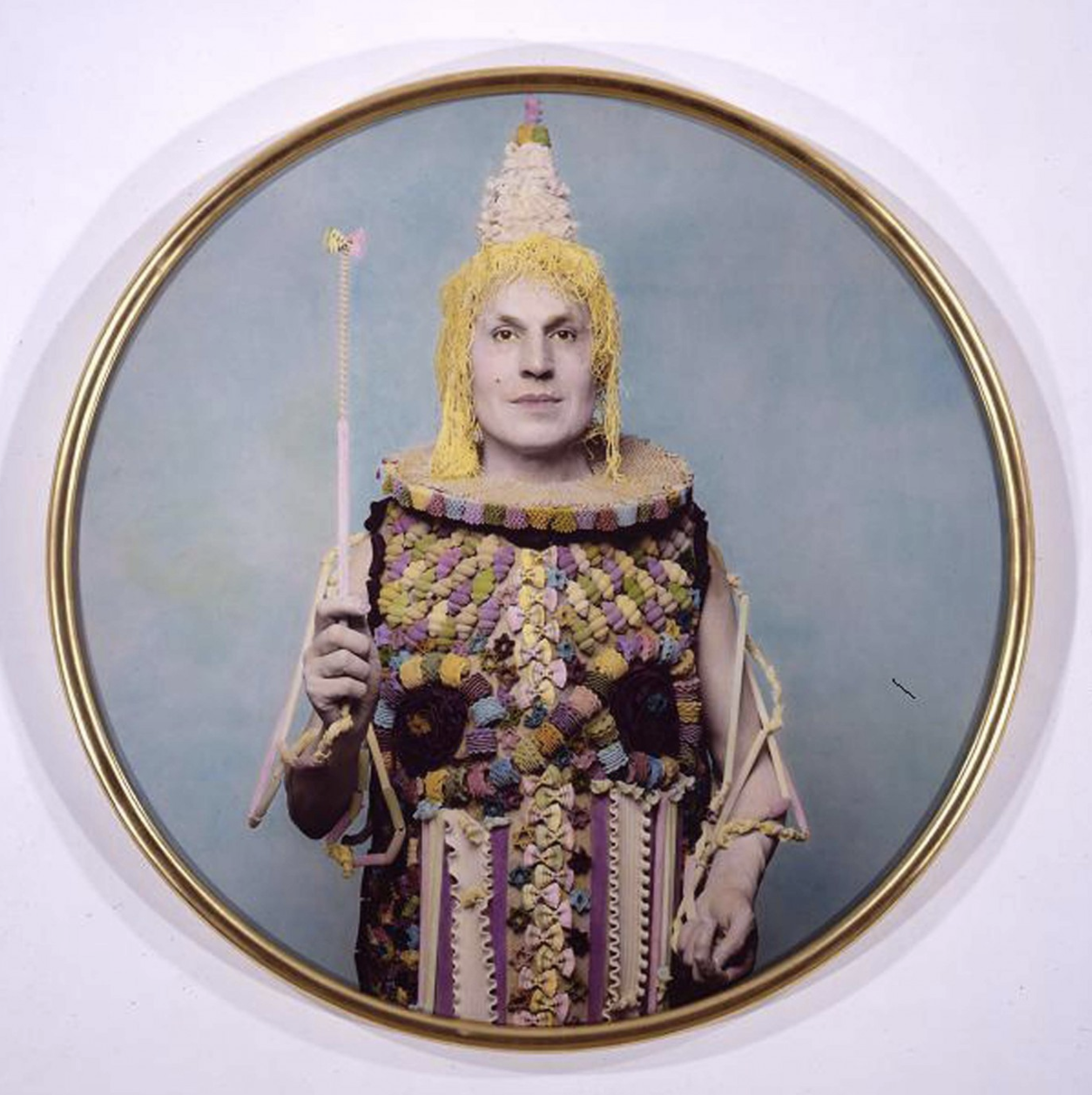 Throughout his long career Ontani has expressed his creativity and poetics through the use of many different techniques: from his “oggetti pleonastici” (1965–1969), made in plaster, to the “stanza delle similitudini,” made with objects cut in corrugated fiberboard. He has often anticipated the use of techniques subsequently adopted by other artists: his first Super 8 films were made between 1969 and 1972. With his work “Ange Infidele” (1968) Ontani begins to experiment with photography. From the beginning his photography has been characterized by some particular elements: the subject is always the artist himself, who uses his own body and face to personify historic, mythological, literary and popular themes; the chosen formats are usually miniature and gigantography, and each work is considered unique. From the late 1960s on are “Teofania” (1969), “San Sebastiano nel bosco di Calvenzano, d’apres Guido Reni” Tentazione,” “Meditazione, d’apres de la Tour,” “Bacchino” (1970), “Tell il Giovane,” “Raffaello,” “Dante,” ” Pinocchio” (1972), “Lapsus Lupus,” the diptych “EvAdamo” (1973), “Leda e il Cigno” (1974), “I grilli e i tappeti volanti” that will be followed by other “d’apres,” and the first Indian cycle “En route vers l’Inde, d’apres Pierre Lotti.” His first artistic photography has a historic importance because it anticipates a phenomenon that will be widespread and popular from the 1980s.
