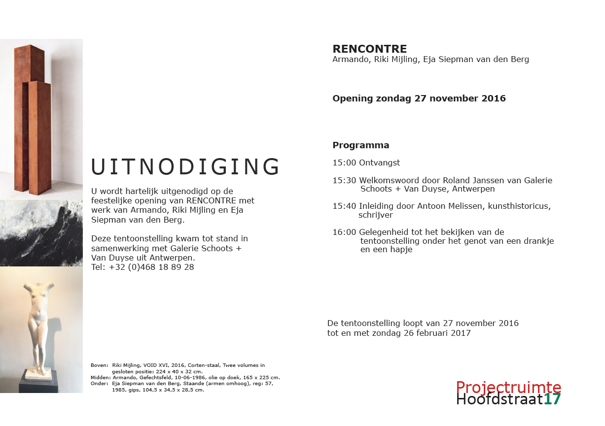 Another and exciting small exhibition to be opened in Projectruimte Hoofdstraat 17 has just been announced . 3 artists will be presented in conjunction which each other. The homebase of Eja Siepman van den Berg gives room to 2 other artists. This time Riki Mijling and Armando will be the guests. Mijling is the least known of these three, but works are present in the most important and prestigious collections, Caldic, DSM , Zadelhoff and the British museum among them. Armando needs no introduction and is known for his participation in the NUL and Informelen mouvements. Personally i think his Berlin years are his strongest period with the beautiful and impressive Fahnen and Tree paintings. And last there are the sculptures by Eja Siepman van den Berg. Each time i visit the Projectruimte Hoofdstraat 17 i notice how excellent they blend with the works by the other artists. An exhibition to visit in the coming months.