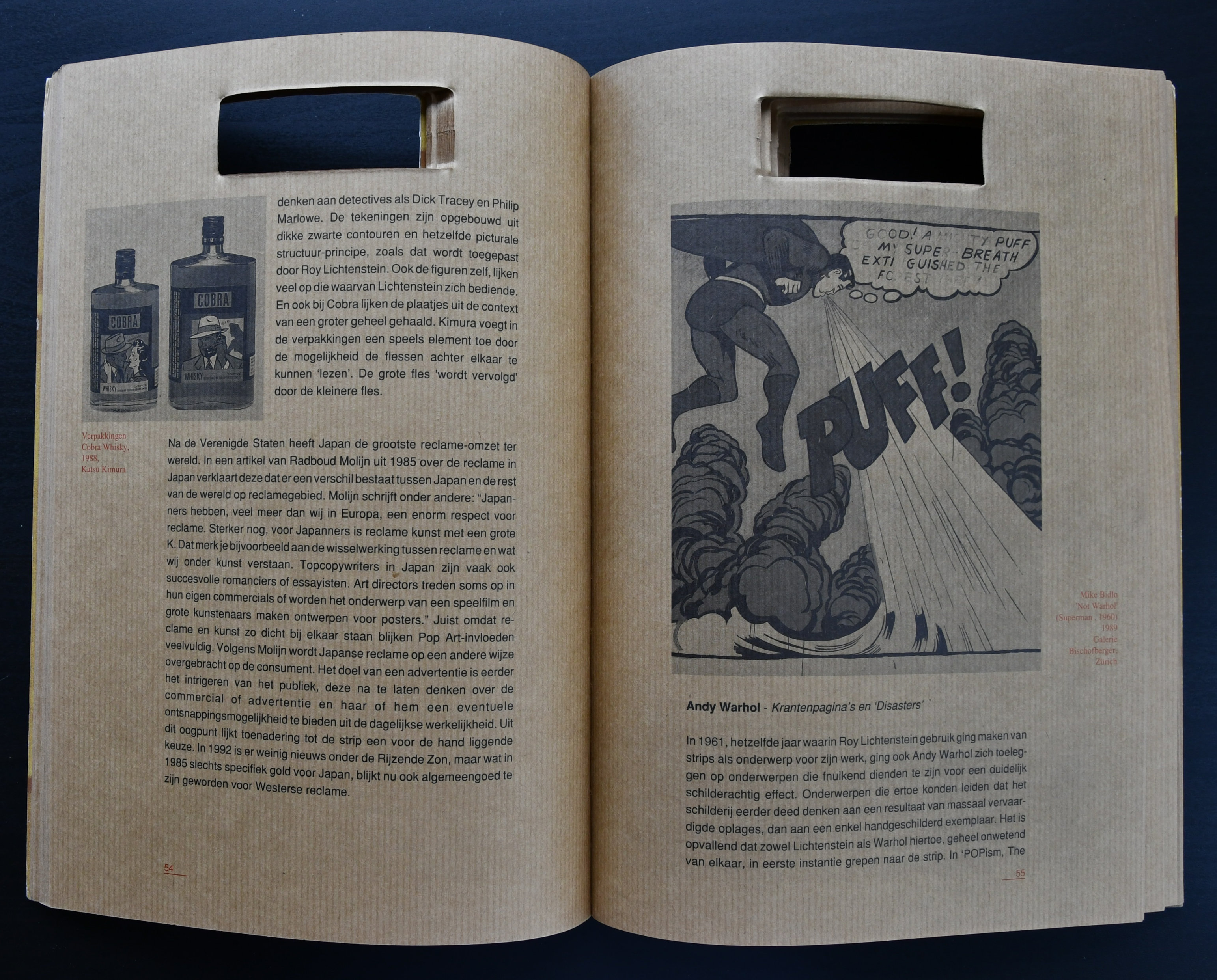 Pop & Artvertising was held at the Museum Bommel van Dam in 1992. The catalogue was designed as a true Pop Art collectible. You could hold the catalogue by a “space” in the cover and pages. Making the catalogue look like a paper bag. The exhibition showed the relation between Pop Art and advertising. Brown paper bag pages throughout except fo the middle . Open the middle and there is a brilliant Pop Up . The design of the catalogue is by Ruud van Soest and in my opinion this is certainly a highly collectable Pop Art catalogue.This catalogue is now available at www.ftn-books.com