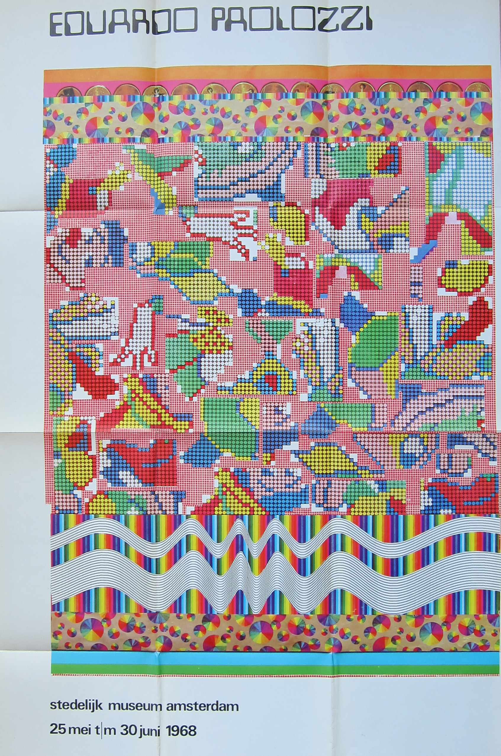 There are multiple reasons to like the publication no 442. of the Stedelijk Museum Amsterdam. Published in 1968 on the occasion of the Eduardo Paolozzi exhibition this is a 100% original work of art . A serigraphie by Paolozzi in his typical Pop Art style. Folded as issued and when folded out an impressive large work of art. Design?….by Wim Crouwel who used the backside of the serigraphie for all the information on Paolozzi. A great Pop Art work of art and available at www.ftn-books.com