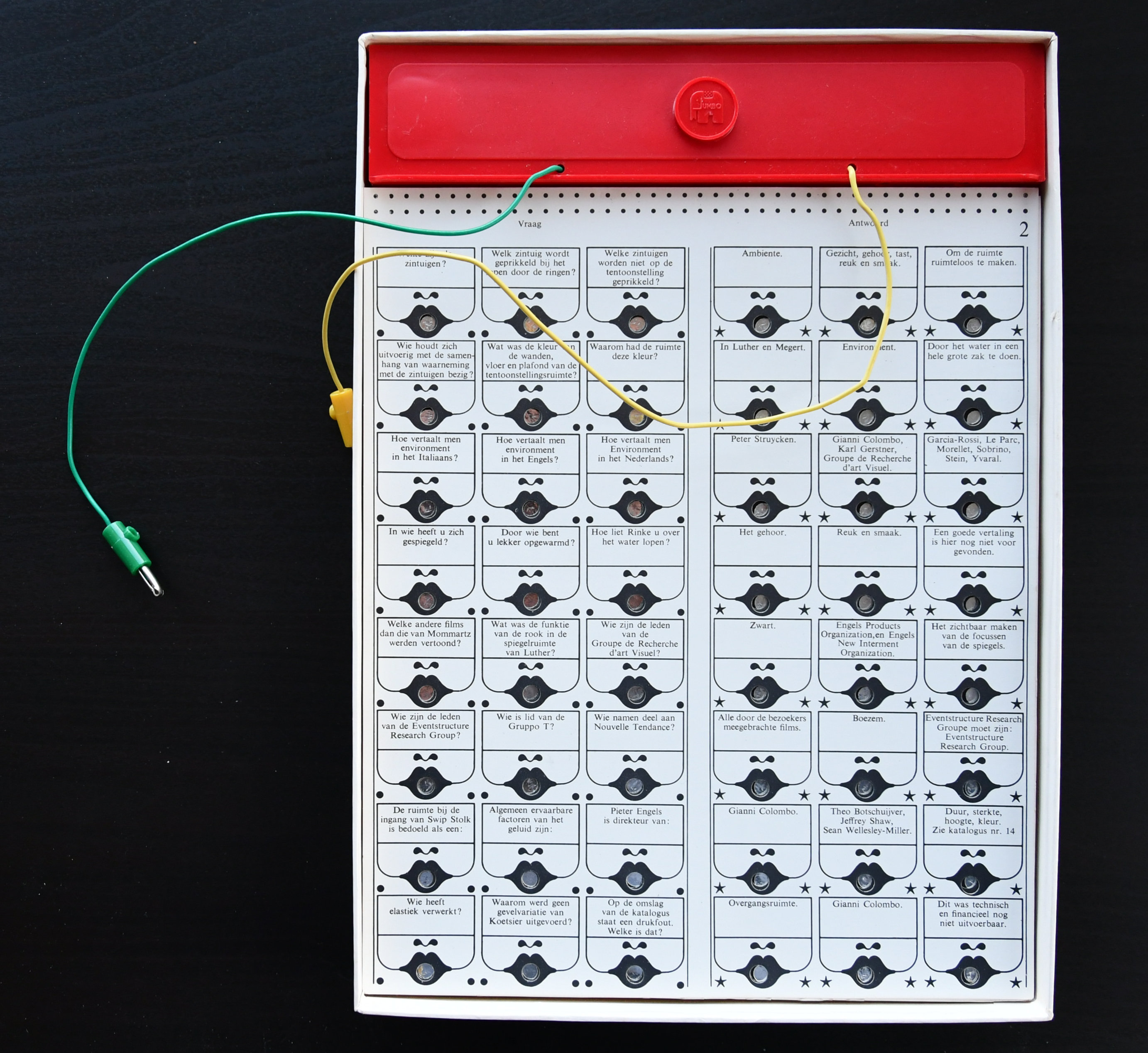 Imagine the old dutch game of ELECTRO . You habe to find the right combination between question and answer and than the light will light up when the answer is correct. This was the idea behind the play catalogue Swip Stolk designed together with Frans Haks for the ENVIRONMENT exhibition they organied in 1968 fro Studium Generale Utrecht.