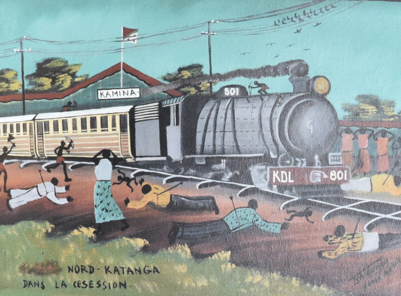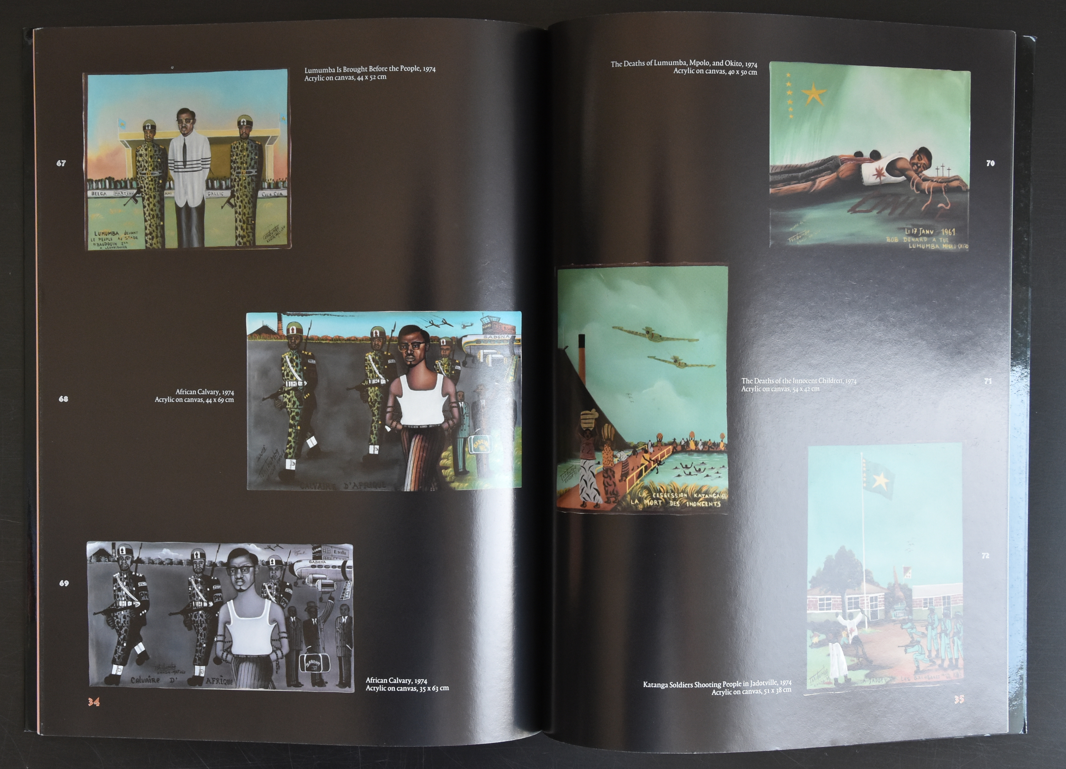 Among the scenes depicted by TKM was the Elisabethville Massacre of 1941, Patrice Lumumba’s independence speech of 30 June 1960, the introduction of culture obligatoire farming, and the trial of the religious leader Simon Kimbangu by the Belgian colonial authorities in 1921. All the paintings were made at the time of the Shaba Invasions during which TKM’s native province of Shaba witnessed widespread political instability.