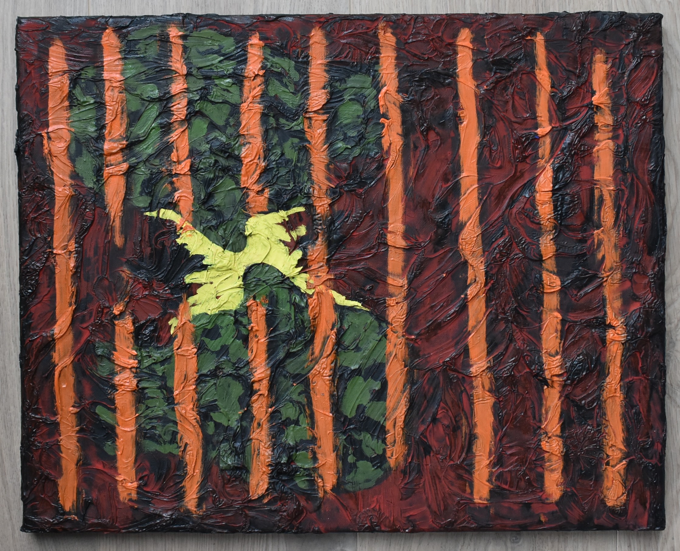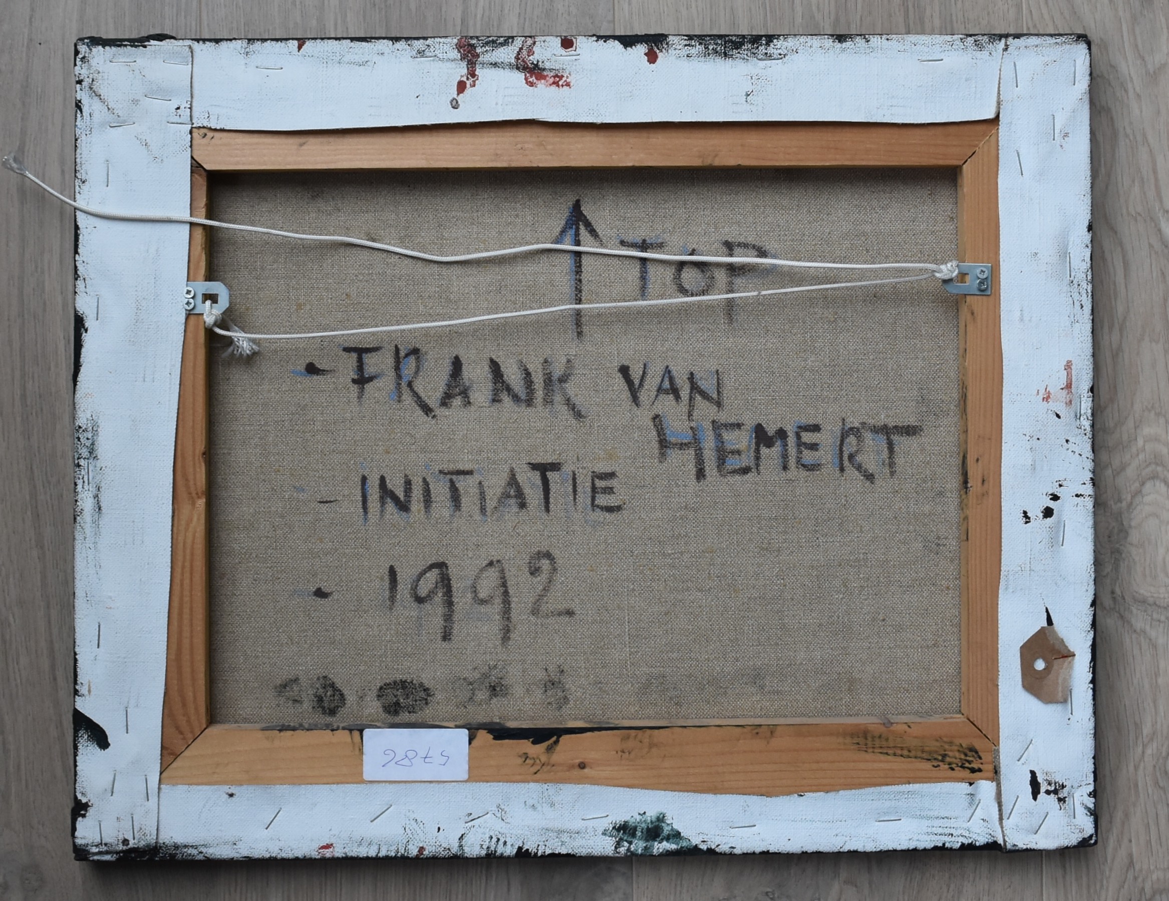 Yesterday i became the winner at auction of a small painting by Frank van Hemert. Followers of the blog know of my admiration for this artist and this small paintimng fits perfectly between the drawings i have in our collection from the same series . The painting “Initiatie” was painted in 1992, measures 50 x 41 cm and has the typical van Hemert touch. Green and red Paint is “worked’ into a composition as a background for a grid of orange stripes.