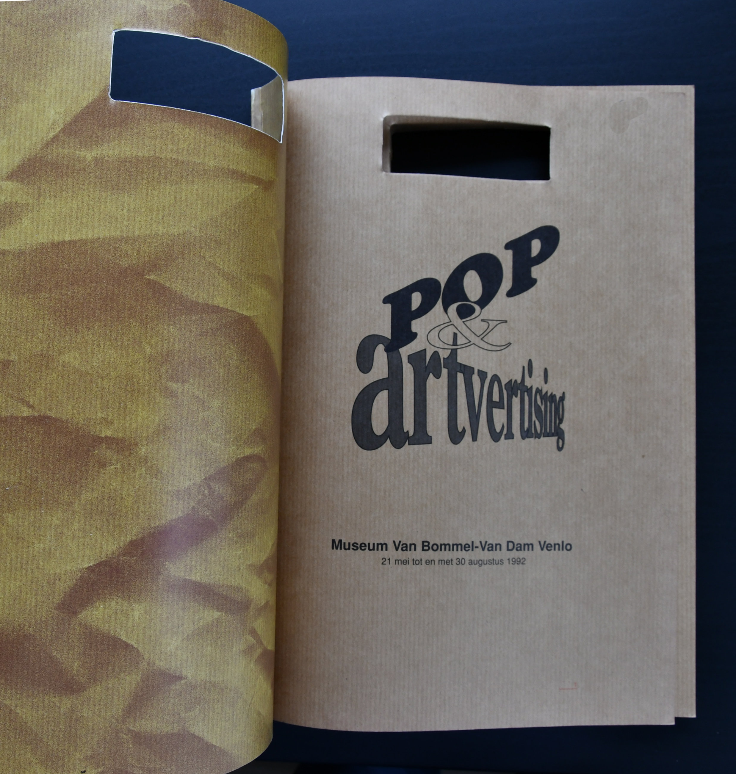 Pop & Artvertising was held at the Museum Bommel van Dam in 1992. The catalogue was designed as a true Pop Art collectible. You could hold the catalogue by a “space” in the cover and pages. Making the catalogue look like a paper bag. The exhibition showed the relation between Pop Art and advertising. Brown paper bag pages throughout except fo the middle . Open the middle and there is a brilliant Pop Up . The design of the catalogue is by Ruud van Soest and in my opinion this is certainly a highly collectable Pop Art catalogue.This catalogue is now available at www.ftn-books.com