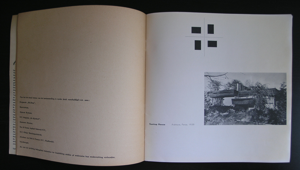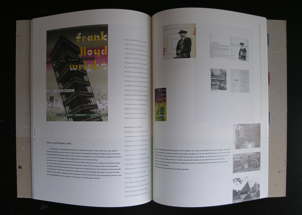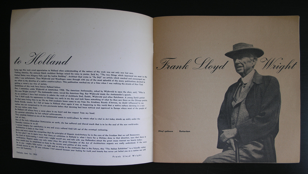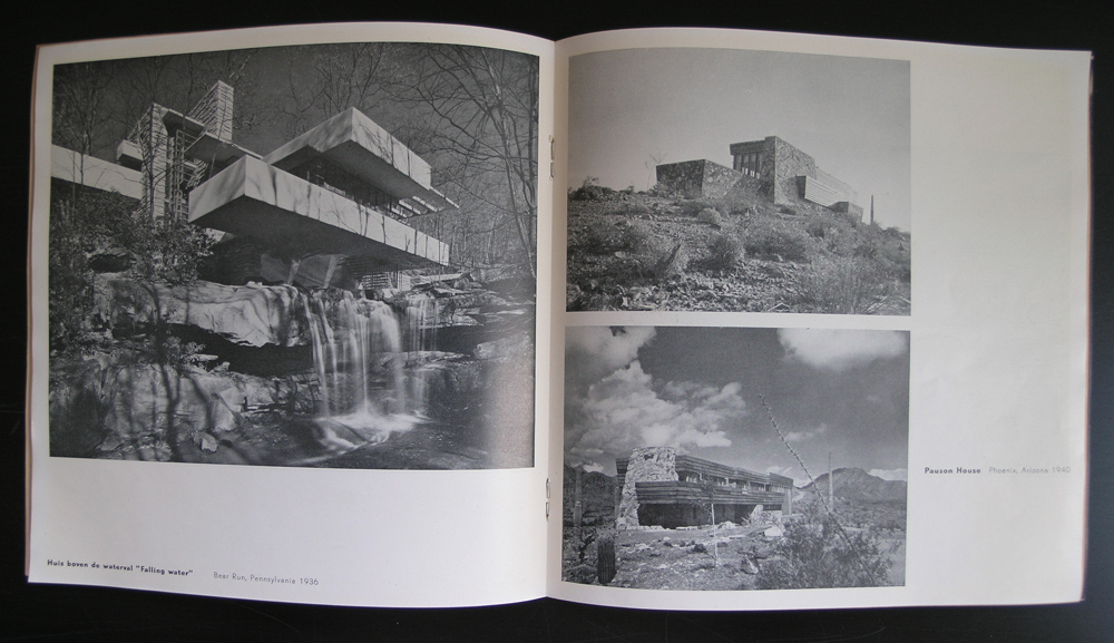 One of the first projects and designs Benno Wissing did for the Boymans van Beuningen Museum must have been this Frank Lloyd Wright catalogue “fllw”. The year is 1952 and the chosen size is different from the normal sized catalogues the Boymans had published until that date. But the size and lay out suits the subject of architecture. This is one of the hardest to find catalogues on Frank lloyd Wright and i was lucky to find a copy. The condition is not the best possible and i would rate it 6 out of 10 points , but still it is there and now available at www,ftn-books.com. This is the best from both worlds. Great graphic design meets top class architecture.