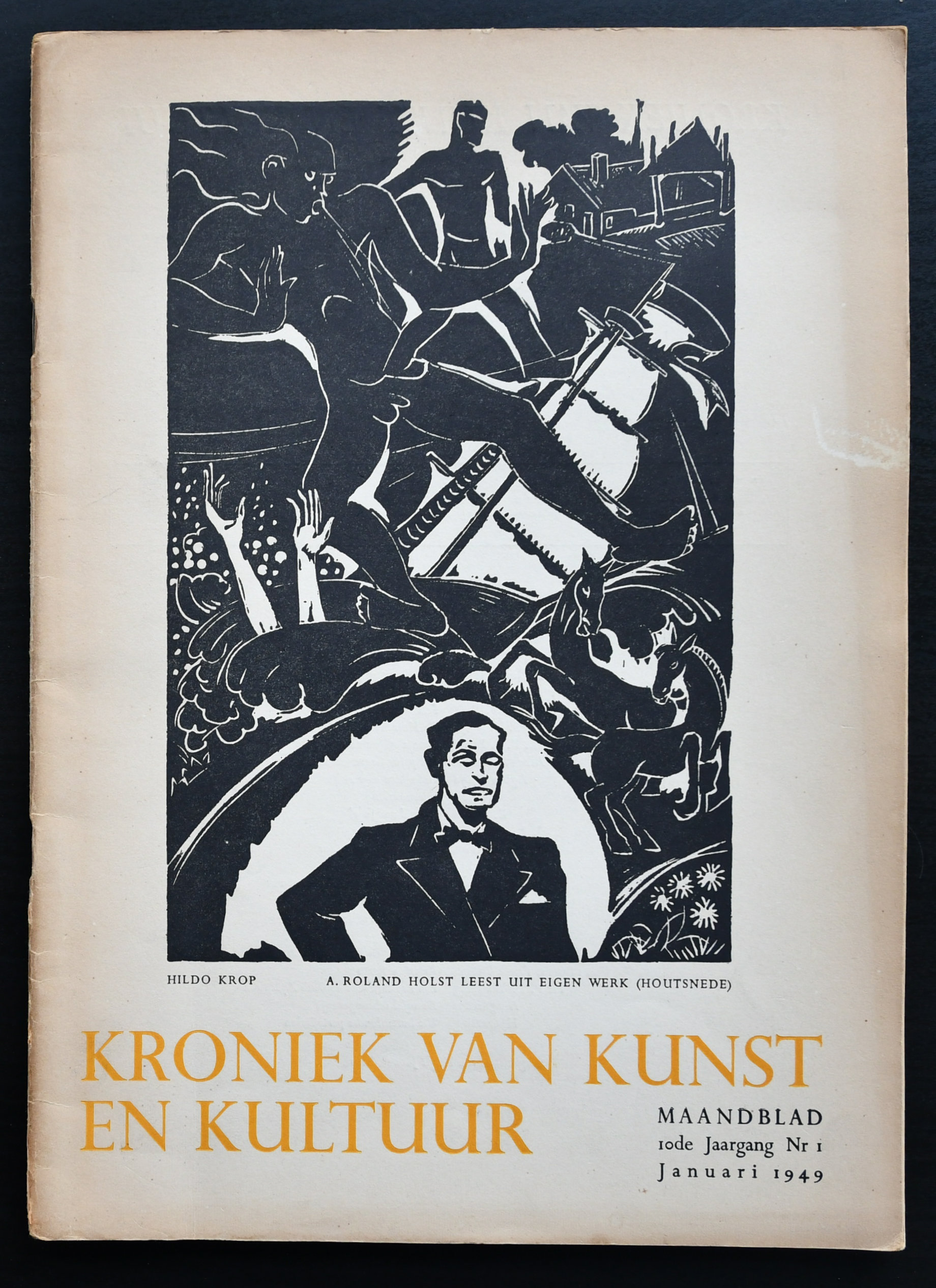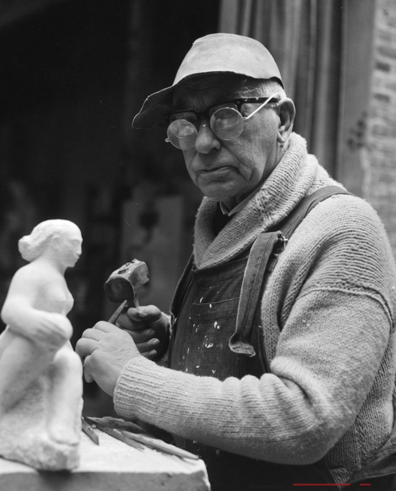 During World War I Minne took a job at the Antwerp city Welfare Department. Here he came into contact with Roger Avermaete who was departmental head. Roger Avermaete had a circle of artistic friends who decided to found a magazine. The magazine ‘Lumière’ was first published in Antwerp in August 1919.[3] The magazine was an artistic and literary journal published in French. Lumière’s title was a reference to the magazine Clarté, that was published in Paris by Henri Barbusse. The principal five artists who illustrated the text and the column headings were Frans Masereel, Jan Frans Cantré, Jozef Cantré, Henri van Straten and Joris Minne. They became known as ‘De Vijf’ or ‘Les Cinq’ (‘The Five’). The magazine ‘Lumière’ was a key force in generating renewed interest in wood engraving in Belgium. The five artists in ‘De Vijf’ group were instrumental in popularizing the art of wood, copper and linoleum engraving and introducing Expressionism in early 20th-century Belgium.